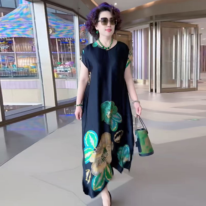 复古大码醋酸真丝连衣裙2025夏季新款宽松遮肉显瘦气质妈妈长裙子