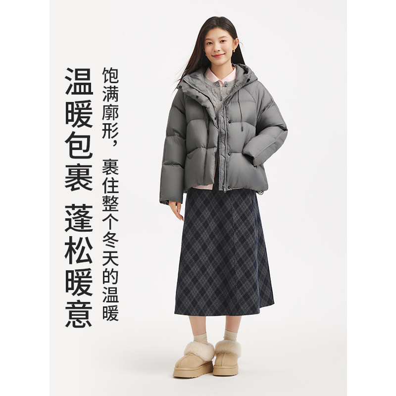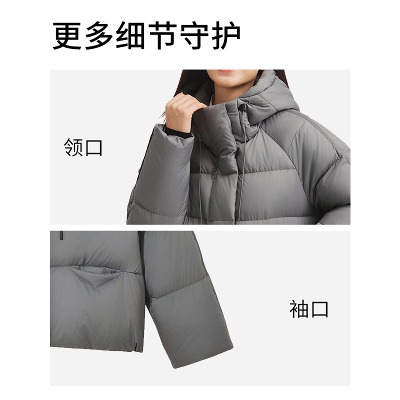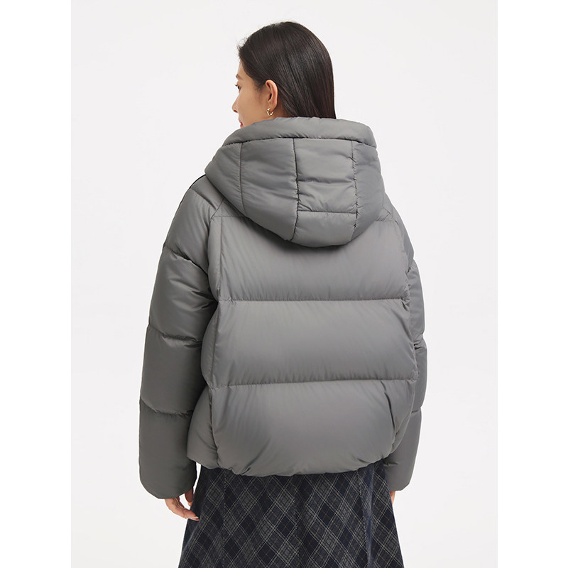热风女士连帽羽绒服2025年冬季新款灰色短款泡芙蓬松羽绒服外套