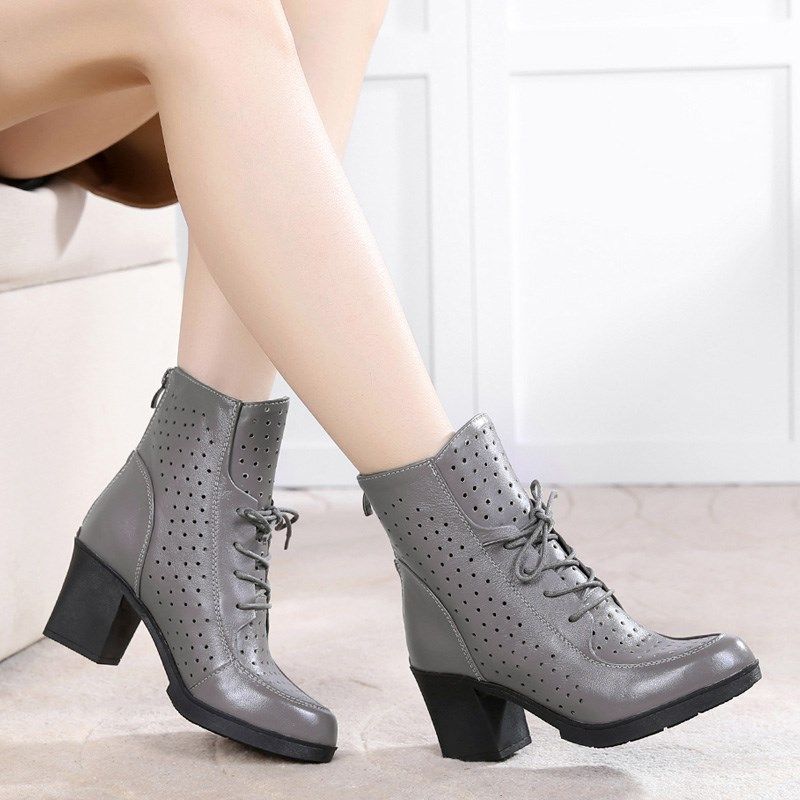 真皮镂空女靴春季新款2025百搭短靴粗跟英伦风马丁靴女鞋春秋单靴