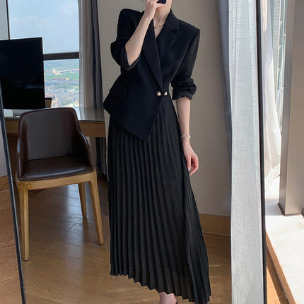 胖mm大码女装秋西装连衣裙200斤韩版收腰显瘦百褶过膝中长款裙子