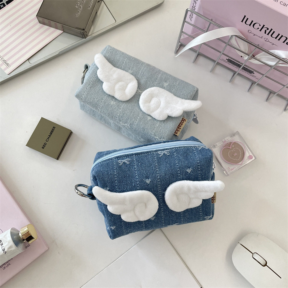 可爱天使翅膀星星牛仔色零钱收纳包学生化妆品便携手拿