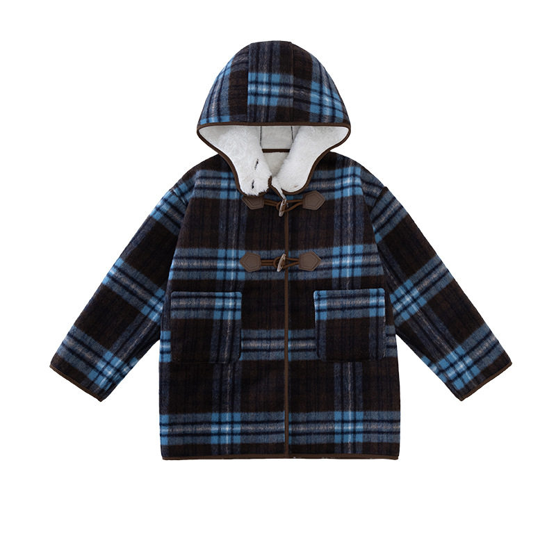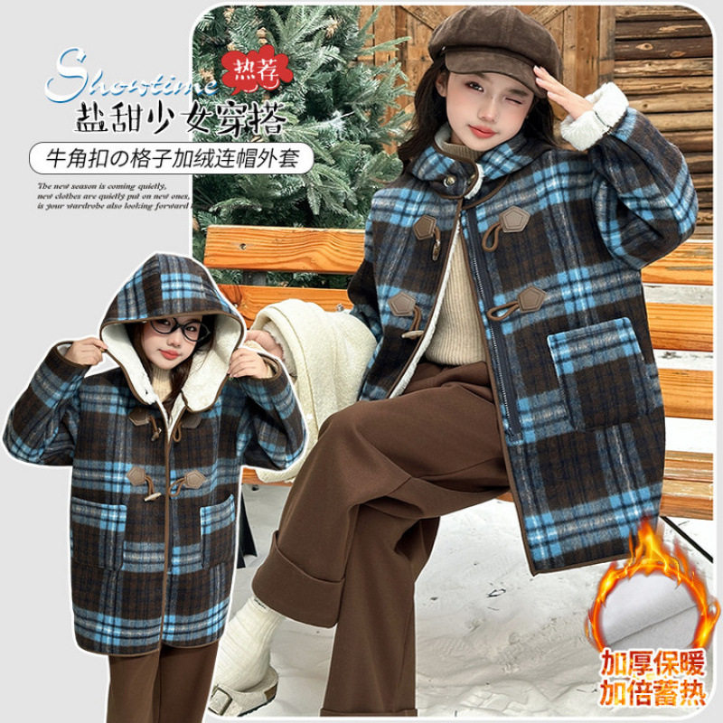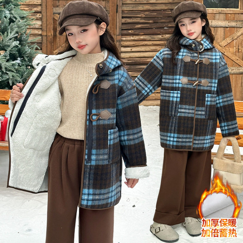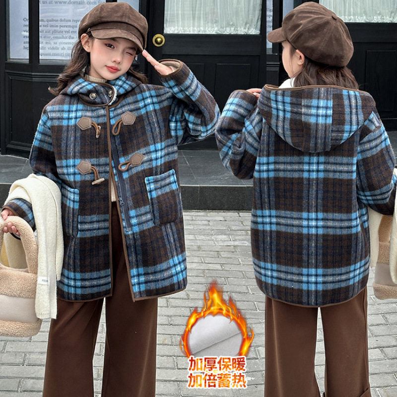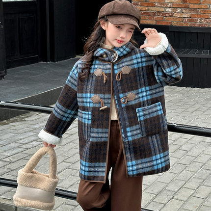 女童格纹呢大衣外套秋冬2025款儿童宽松中长款洋气牛角扣加绒上衣