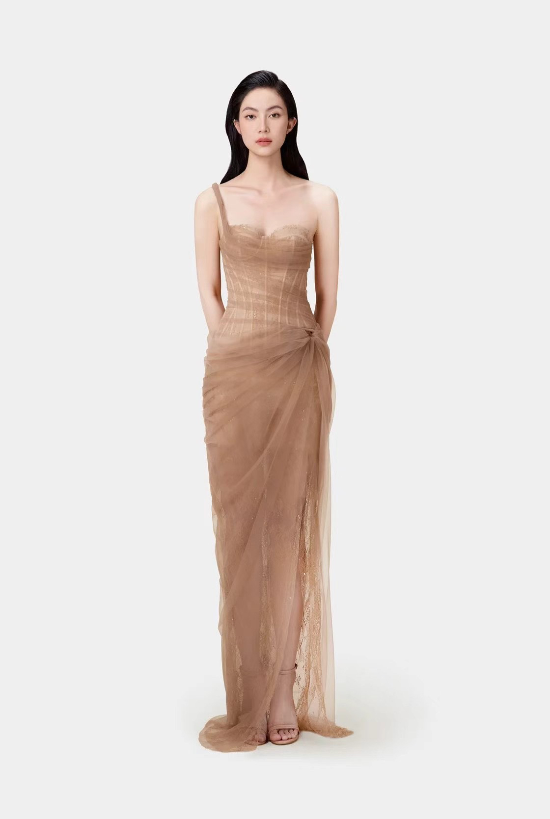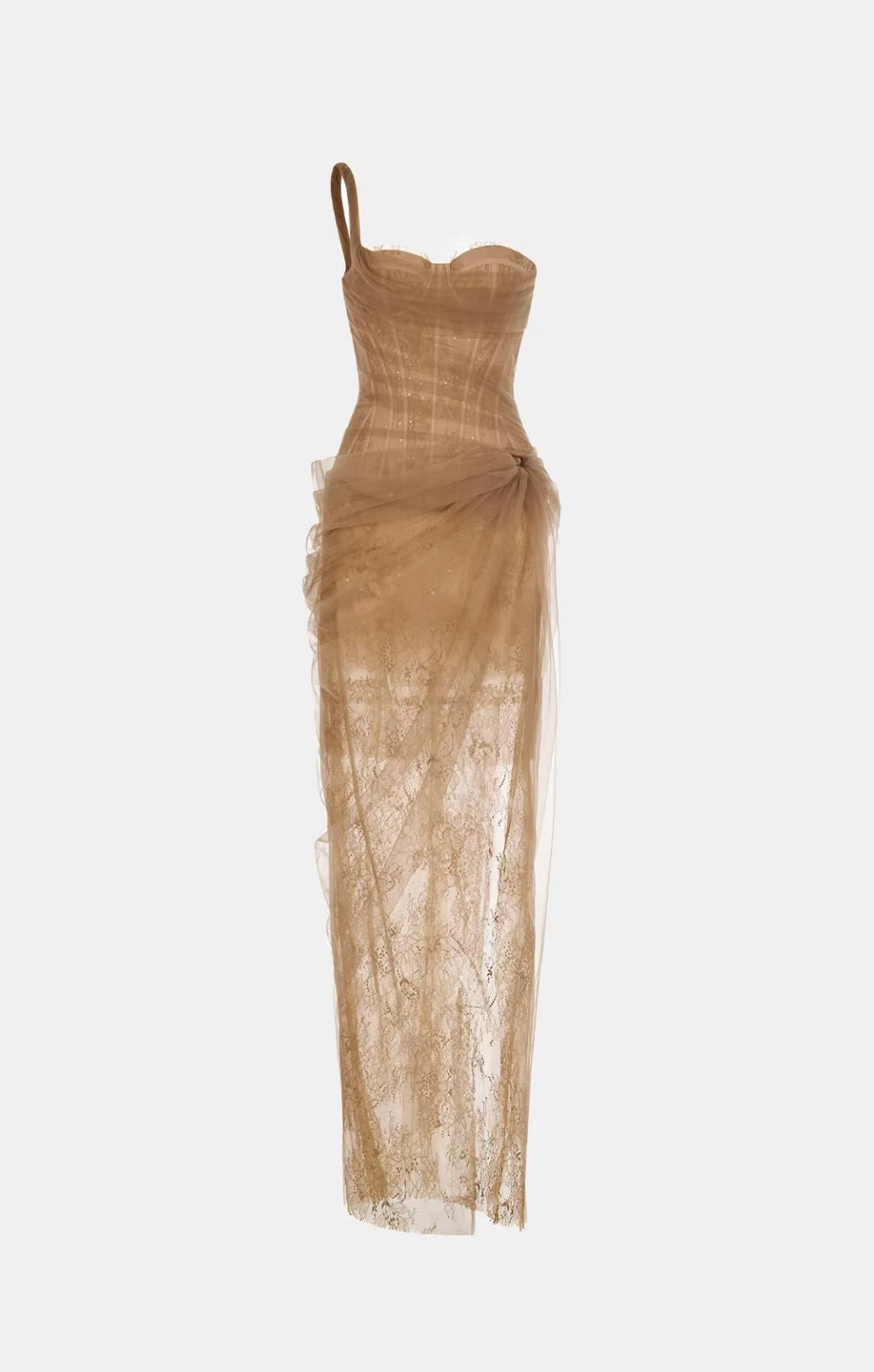 畔依绝美女神越南仙女性感蕾丝网纱鱼骨斜肩开衩晨袍礼服连衣裙