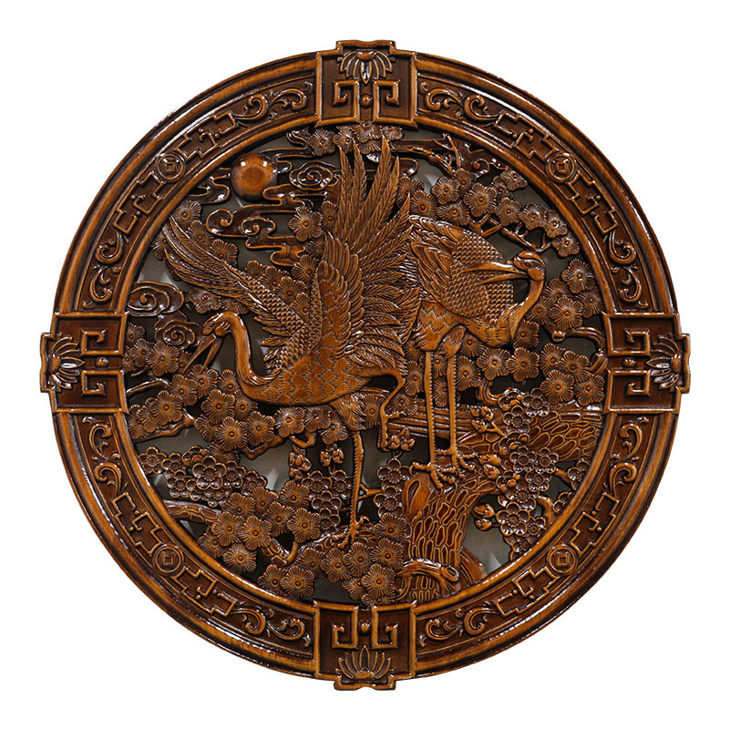 东阳木雕挂件香樟木头雕刻圆形装饰品中式客厅壁挂玄关麒麟装饰画