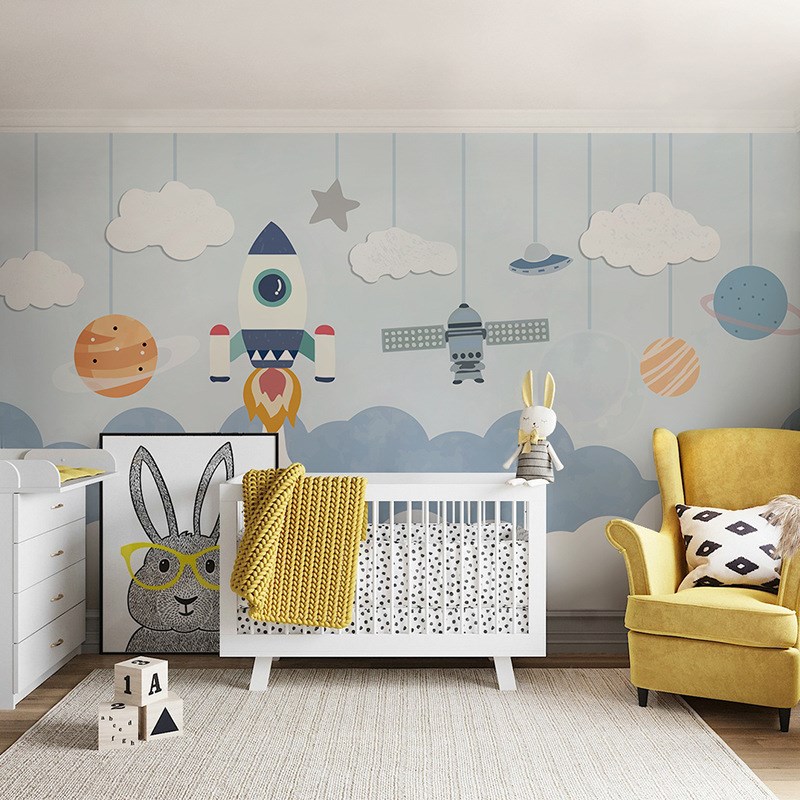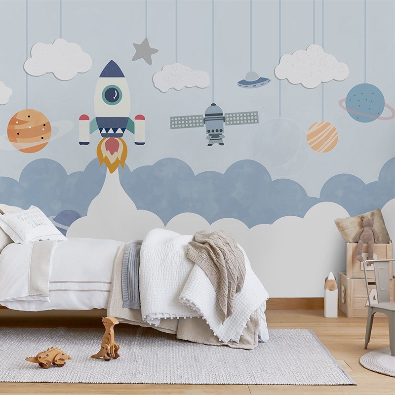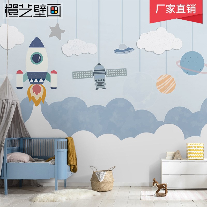卡通儿童房墙布幼儿园背景墙壁画太空火箭星球墙纸男孩卧室壁布3d