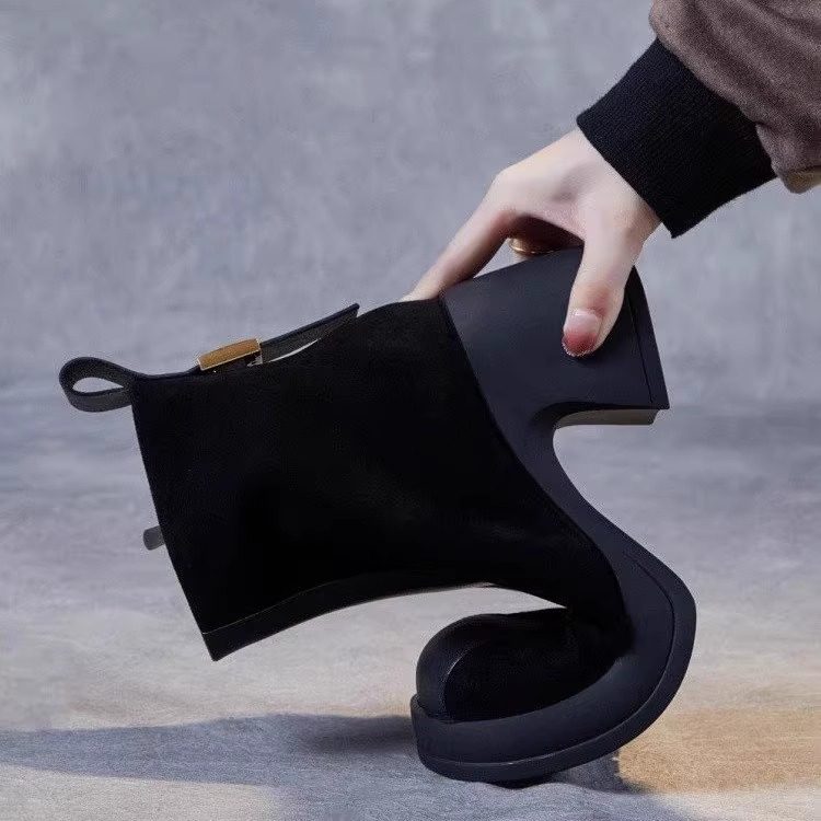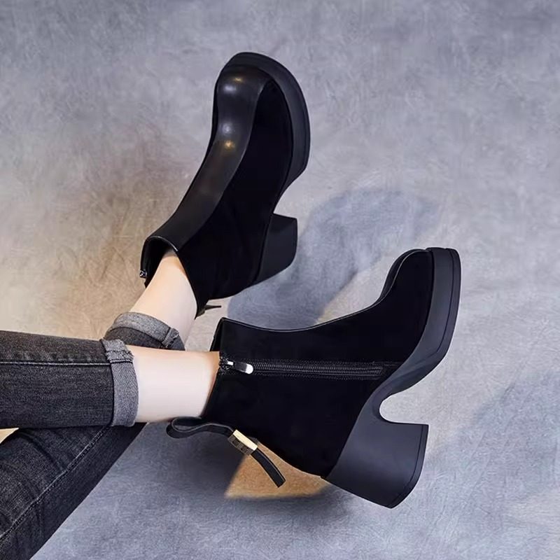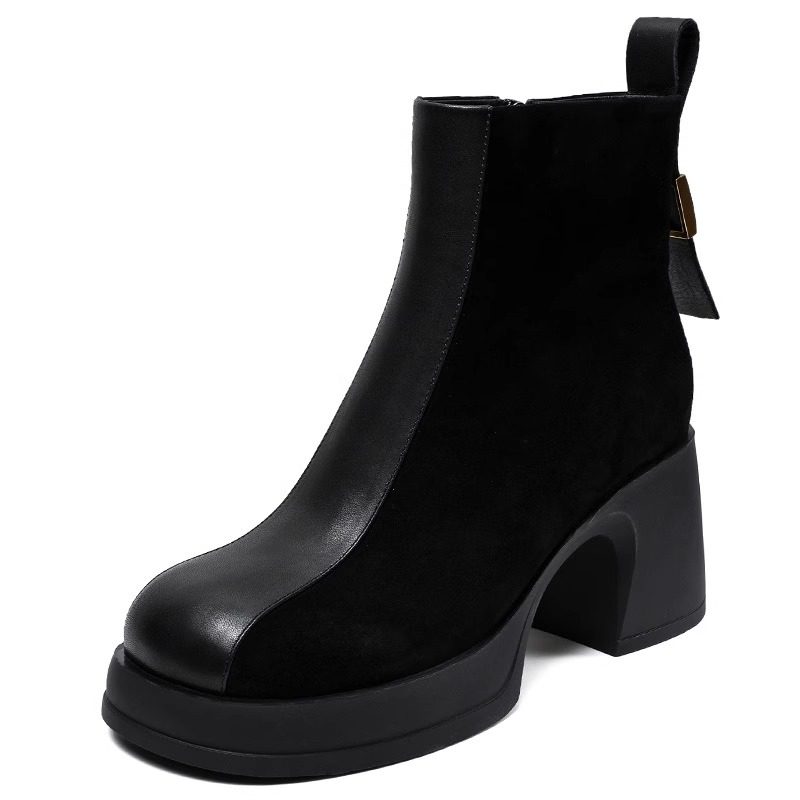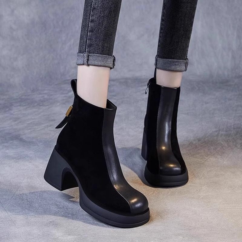 俏大东品牌真皮短靴女2025新款粗跟拼色加绒马丁靴百搭小个子女靴