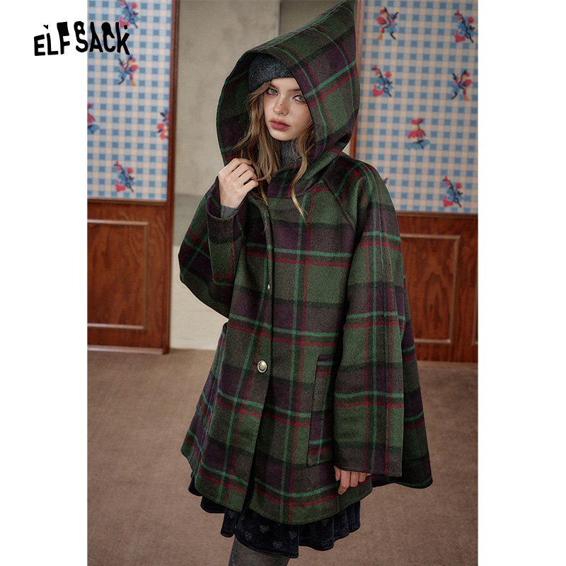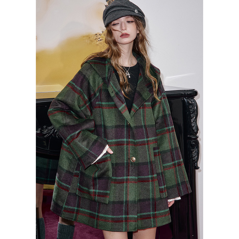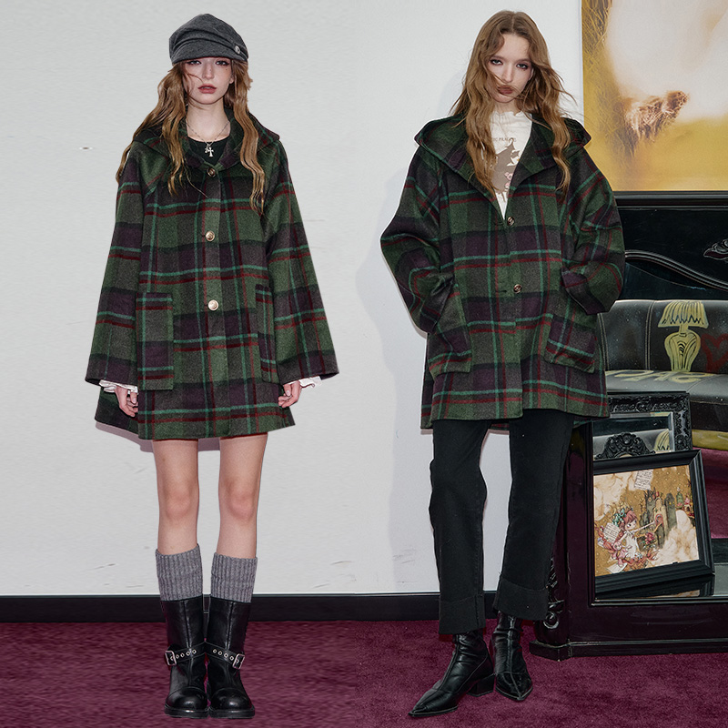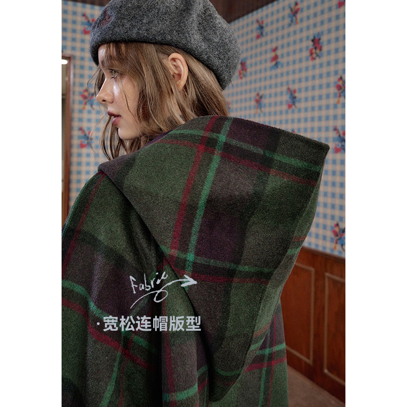 妖精的口袋复古格纹连帽毛呢外套女2025年冬季新款英伦风呢子大衣