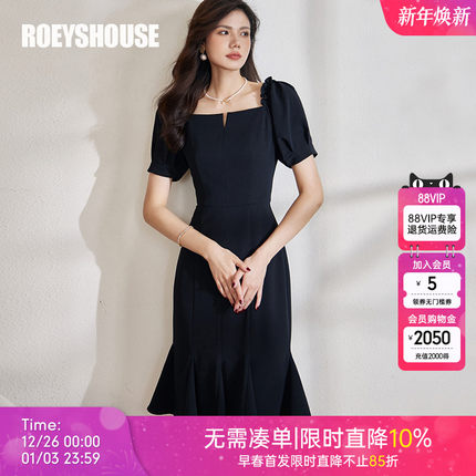 罗衣优雅方领鱼尾摆连衣裙2025夏装新款气质黑色褶皱小黑裙08515