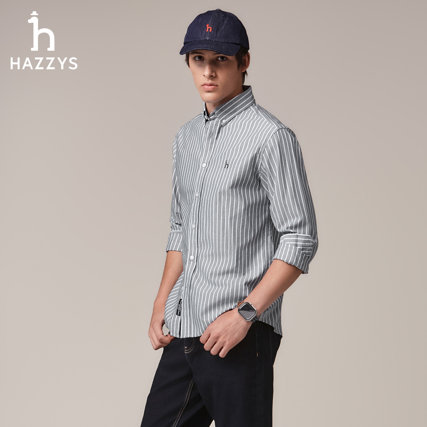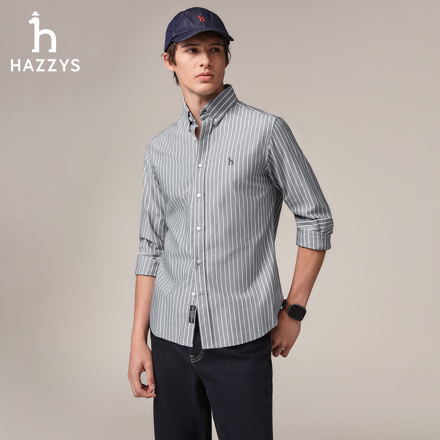 Hazzys哈吉斯奥莱秋季纯棉时尚条纹衬衣男士衬衫休闲通勤长袖上衣