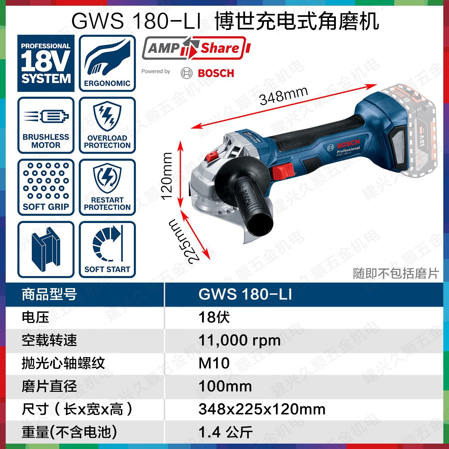 博世GWS180-LI锂电无刷充电式角磨机100mm无刷电机锂电金属切割机