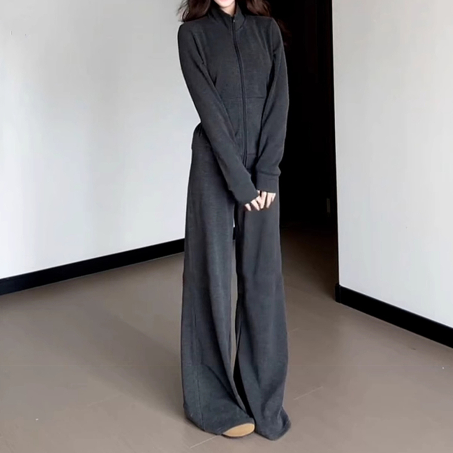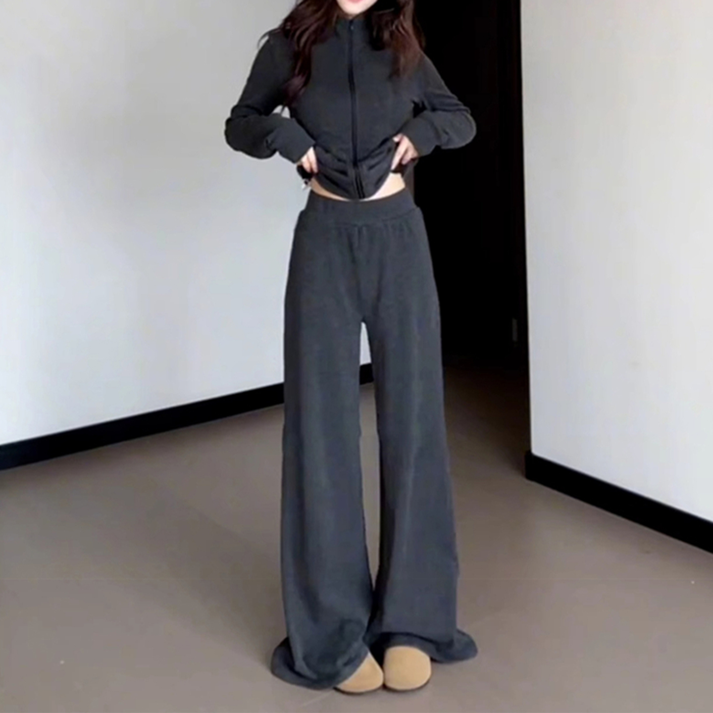洋气显瘦卫衣套装女士上衣外套阔腿裤时尚休闲高级灰条纹2025秋装