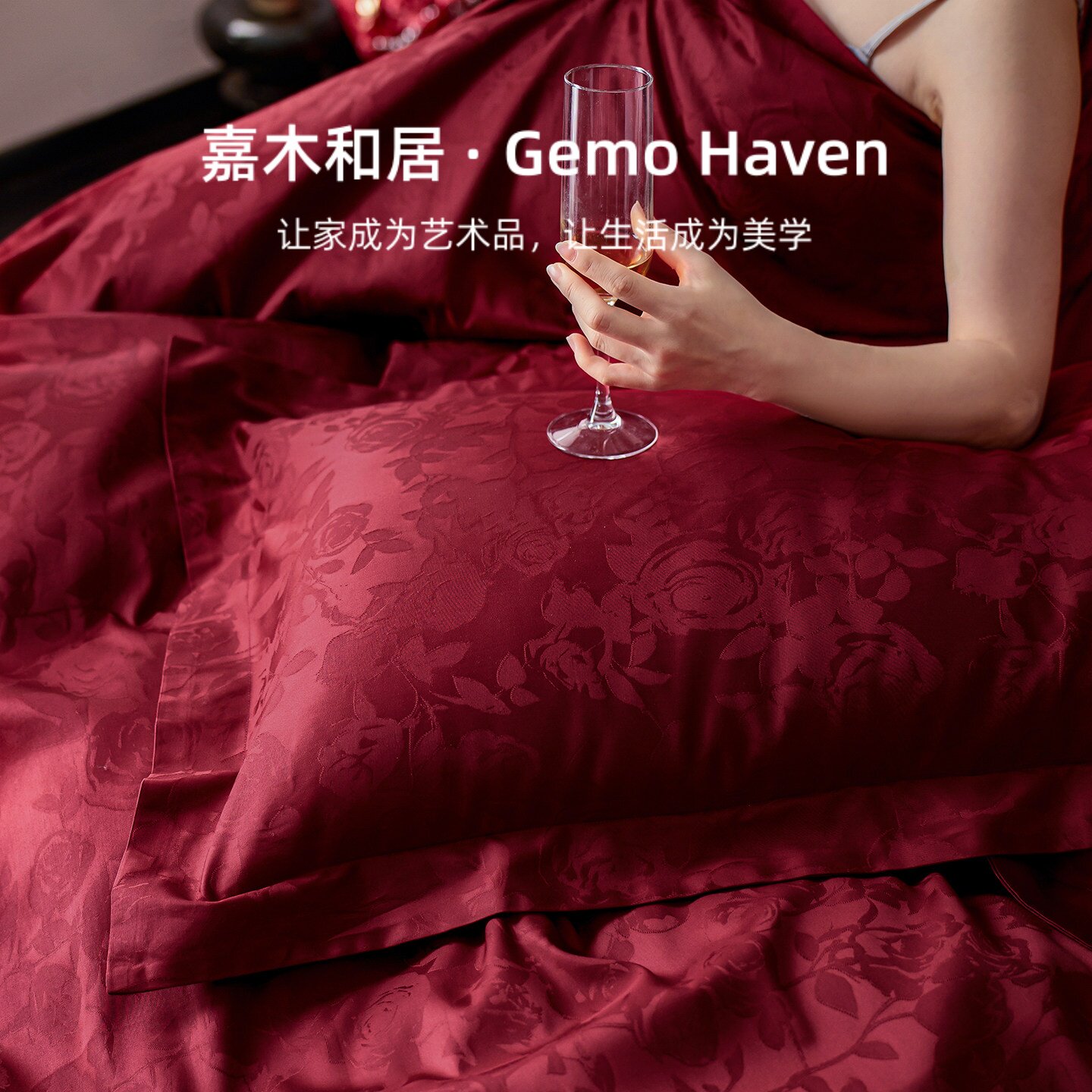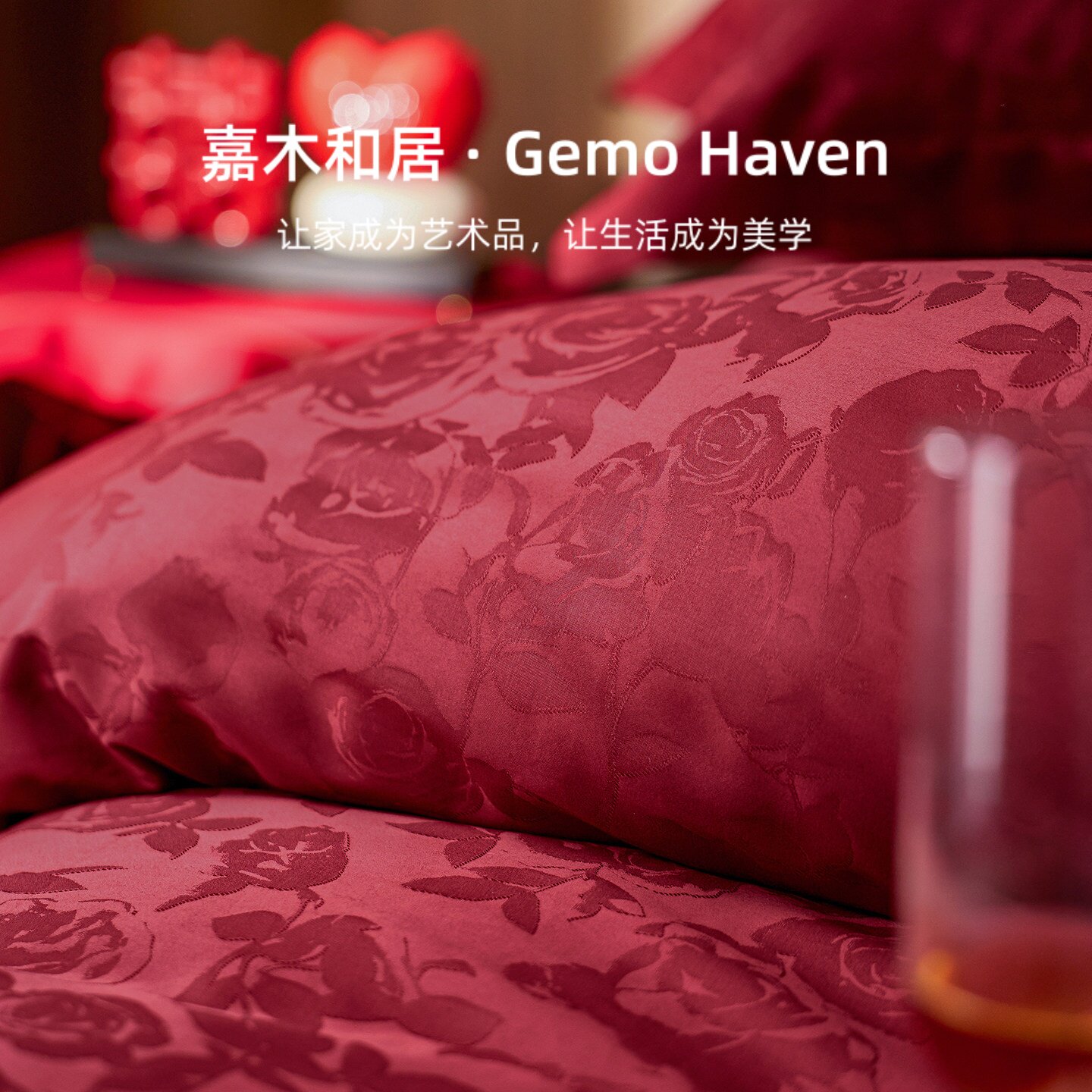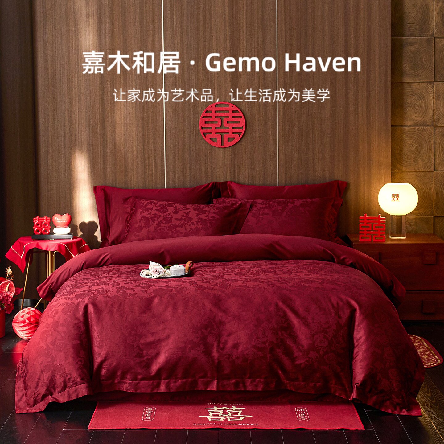 Gemo婚庆四件套全棉结婚大红色100支贡缎提花长绒棉被套床单床上