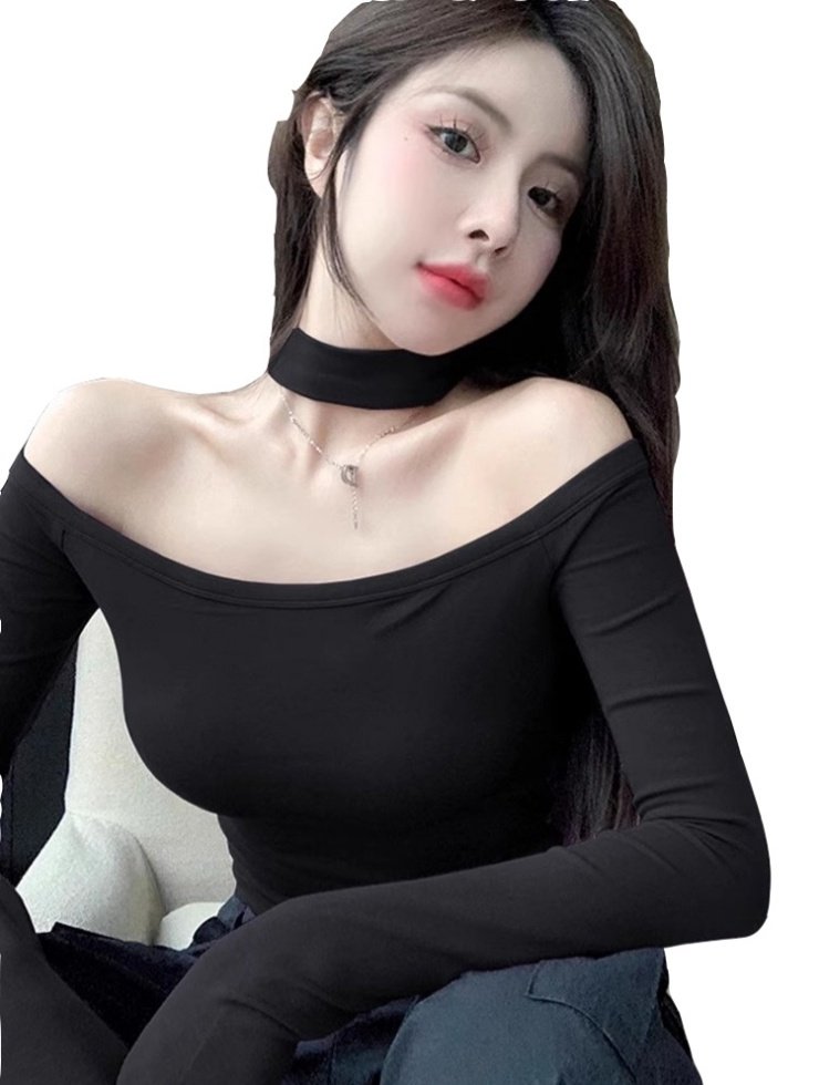 一字肩挂脖设计感长袖打底衫T恤女秋装辣妹小众露肩修身短款上衣
