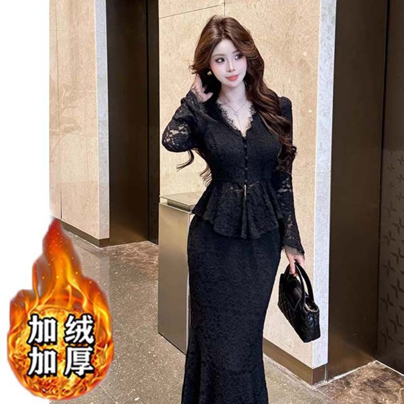 【加绒加厚】【两件套】深v蕾丝上衣高级感包臀鱼尾裙套装TX0304