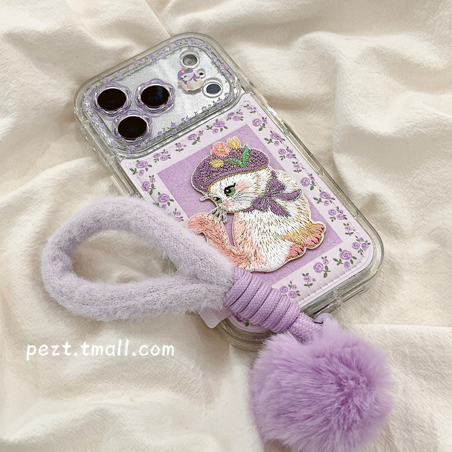 紫色花朵刺绣猫咪可爱卡通适用苹果17手机壳皮质iphone16promax带挂绳17promax新款15防摔套14硅胶16女款全包