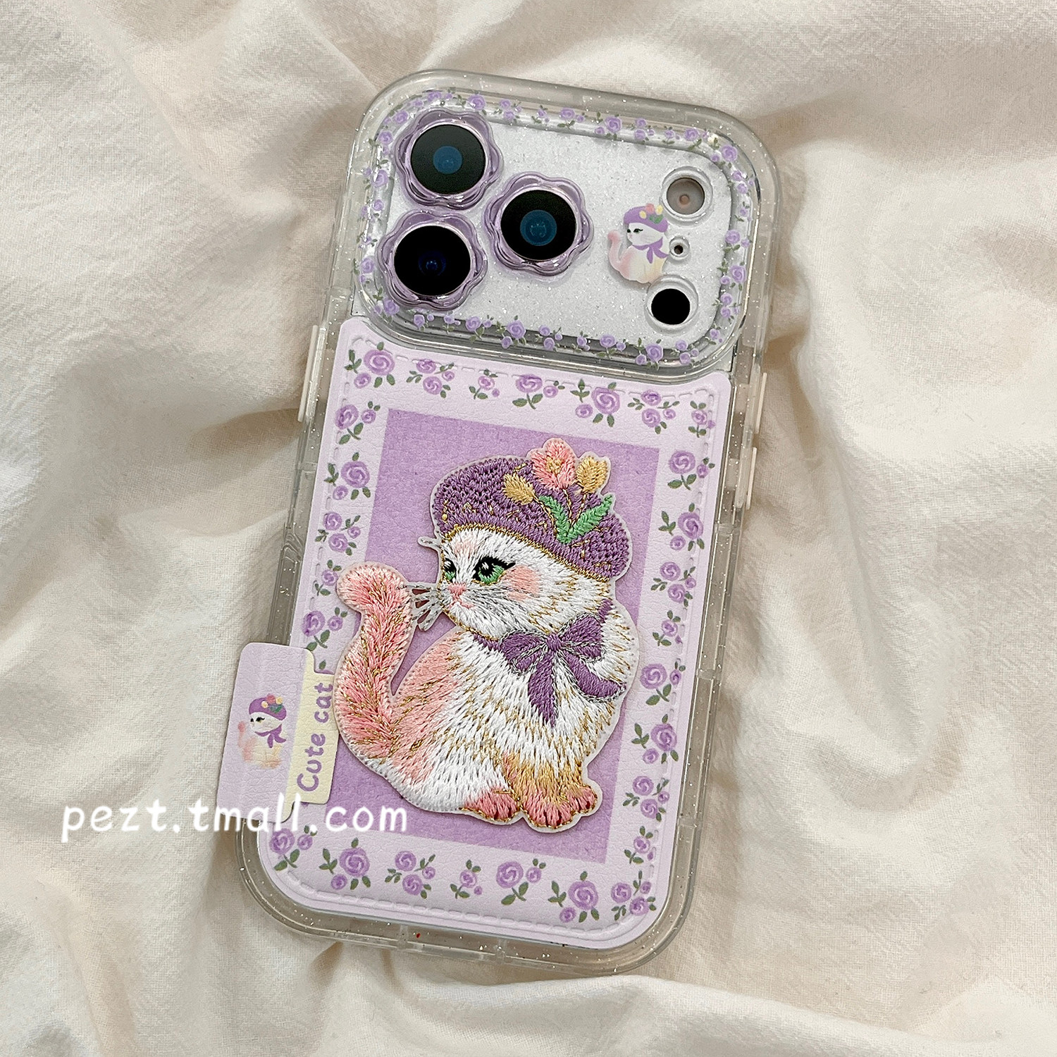 紫色花朵刺绣猫咪可爱手机壳皮质