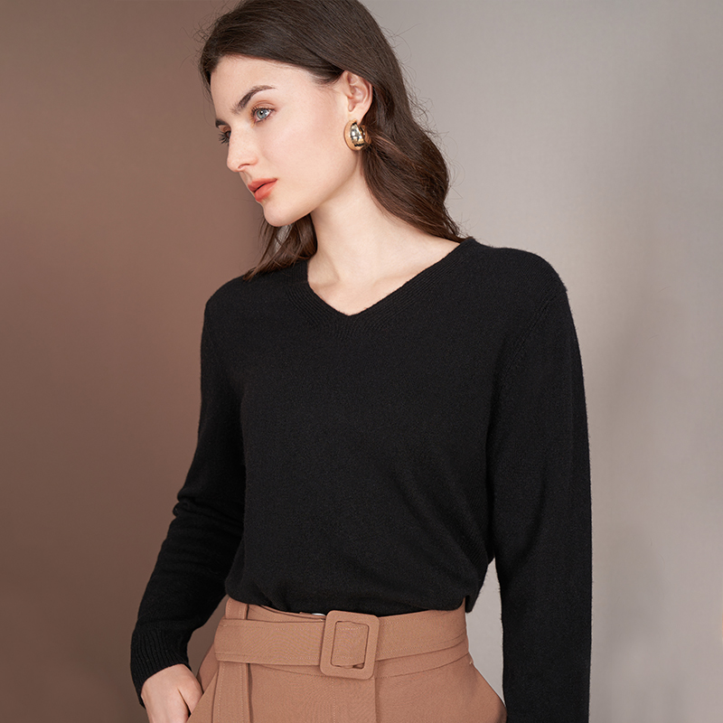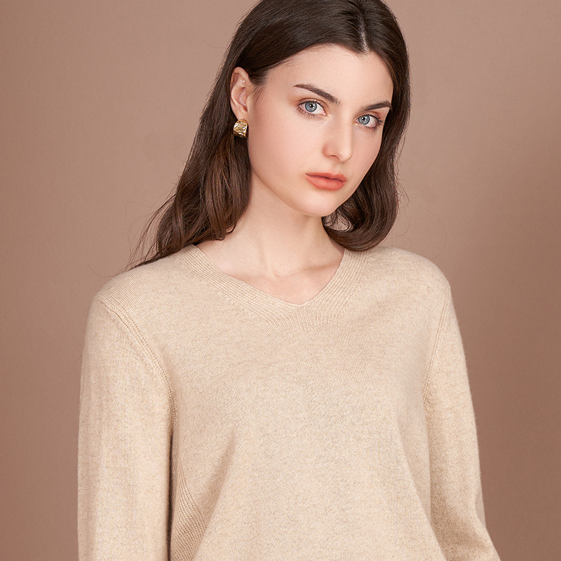 鹿王100%羊绒衫女士V领平面组织女套衫舒适亲肤修身休闲透气新款