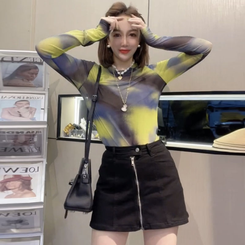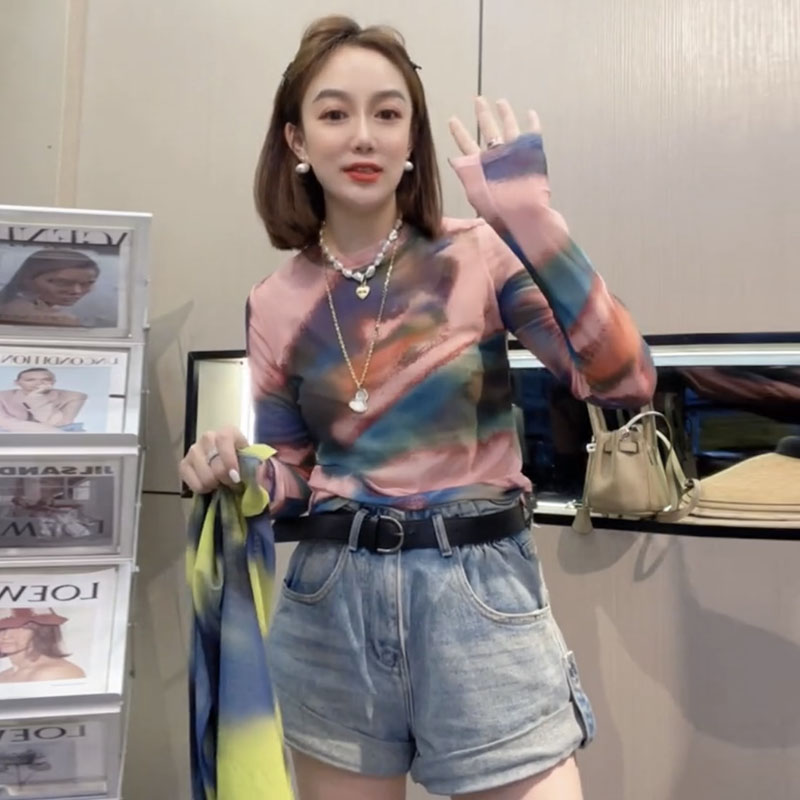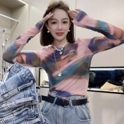 欧洲站2023春夏新款晕染网纱打底衫女时尚洋气百搭圆领套头上衣潮