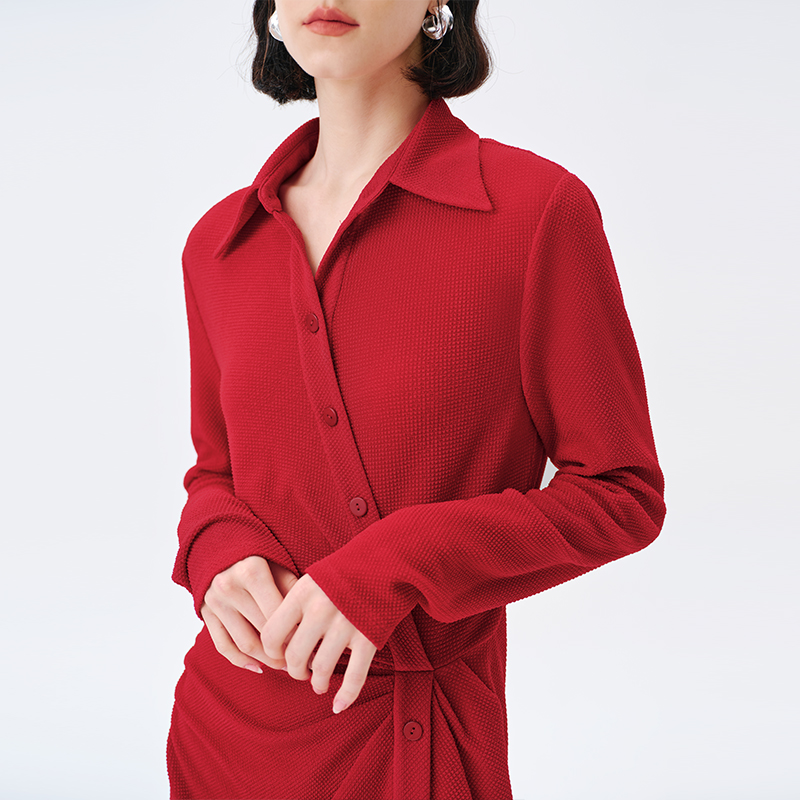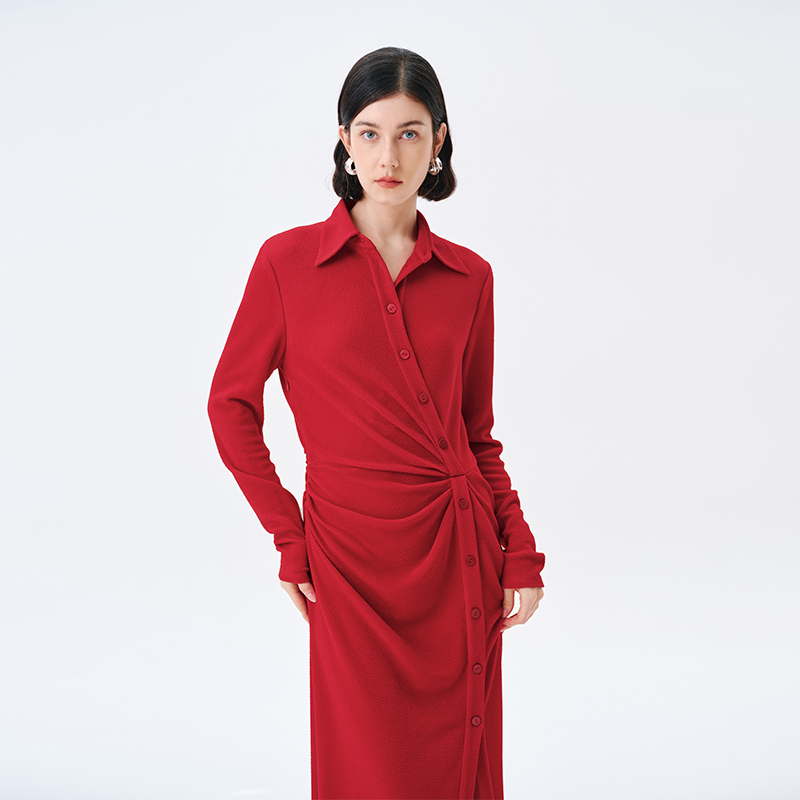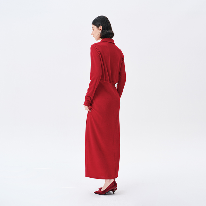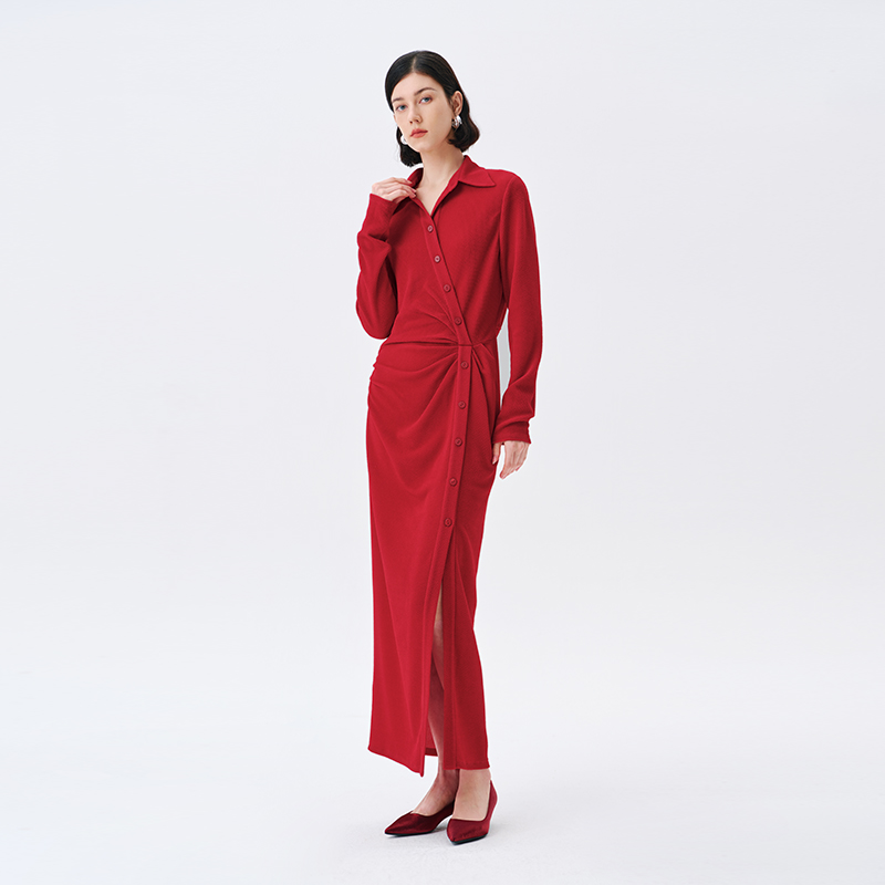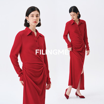 菲埃琳FILINGME 25秋冬新款醋酸针织衬衫式斜门襟修身开衩连衣裙