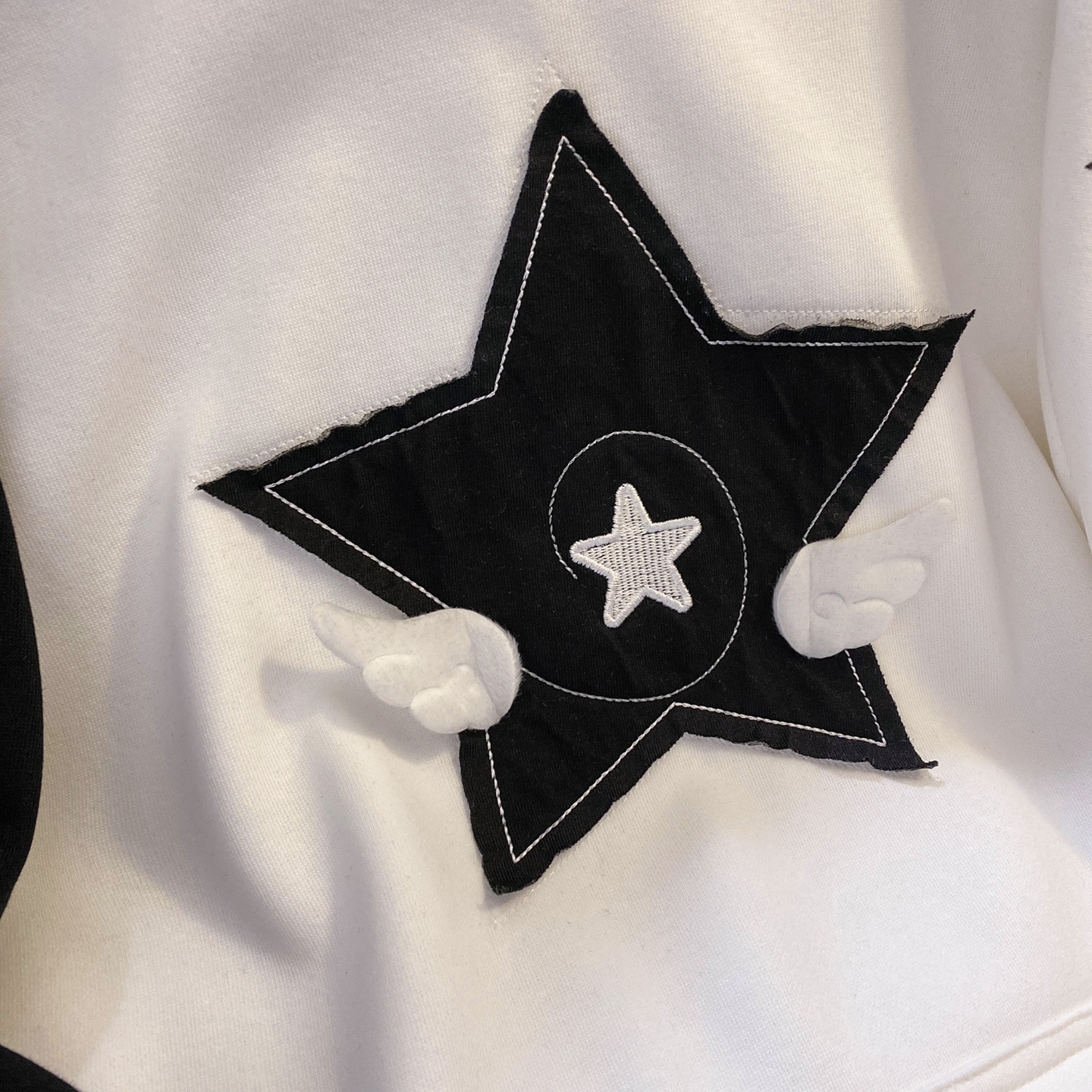 大码美式高街星星刺绣插肩连帽卫衣女秋冬新款加绒宽松小翅膀外套
