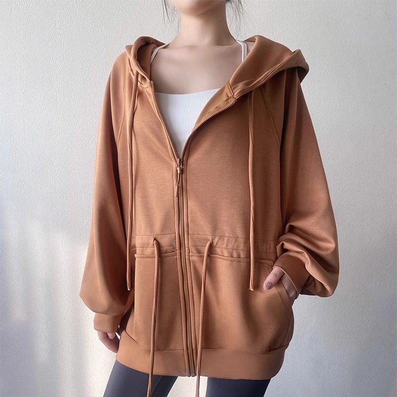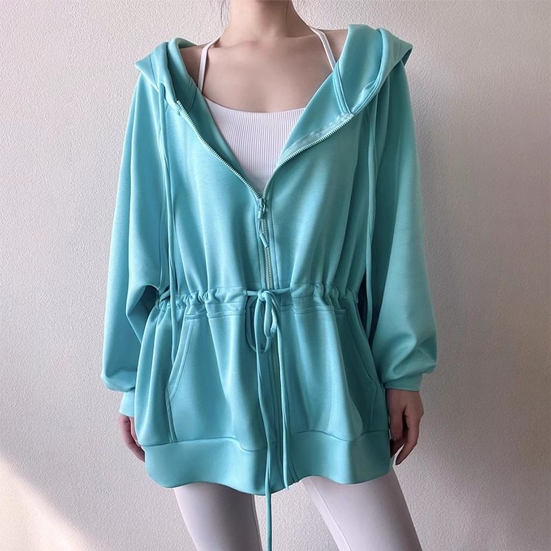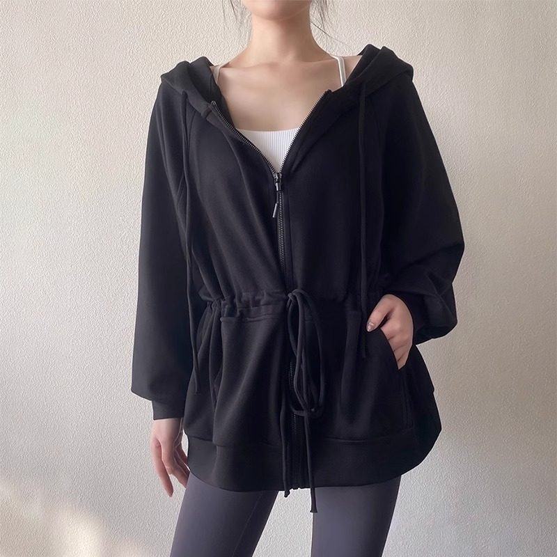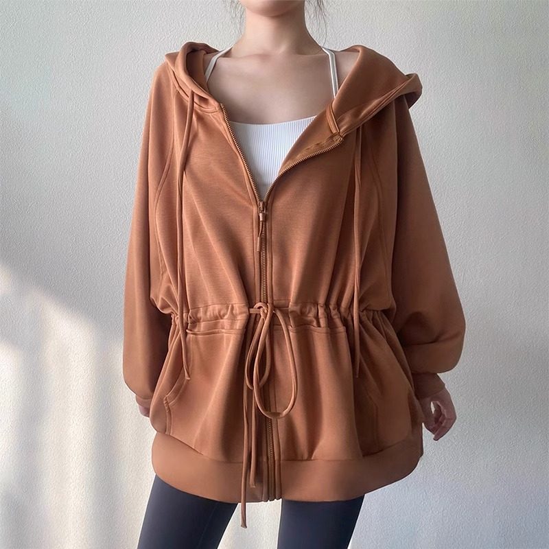 lulu同款瑜伽服外套女春秋新款系带收腰连帽宽松长款遮臀运动上衣