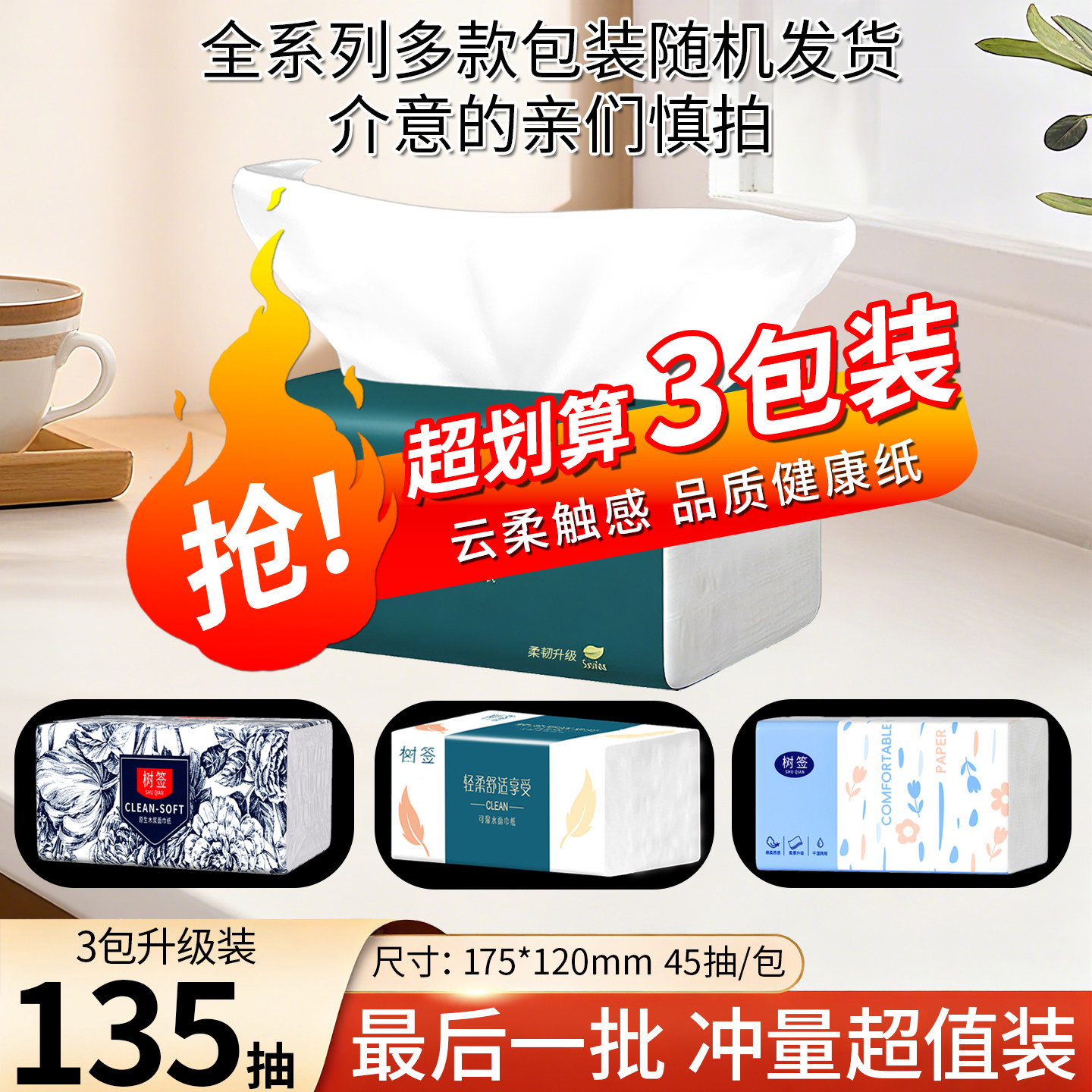 【3包装135抽】家用实惠装餐巾纸卫生纸抽纸巾抽纸擦手纸面巾纸