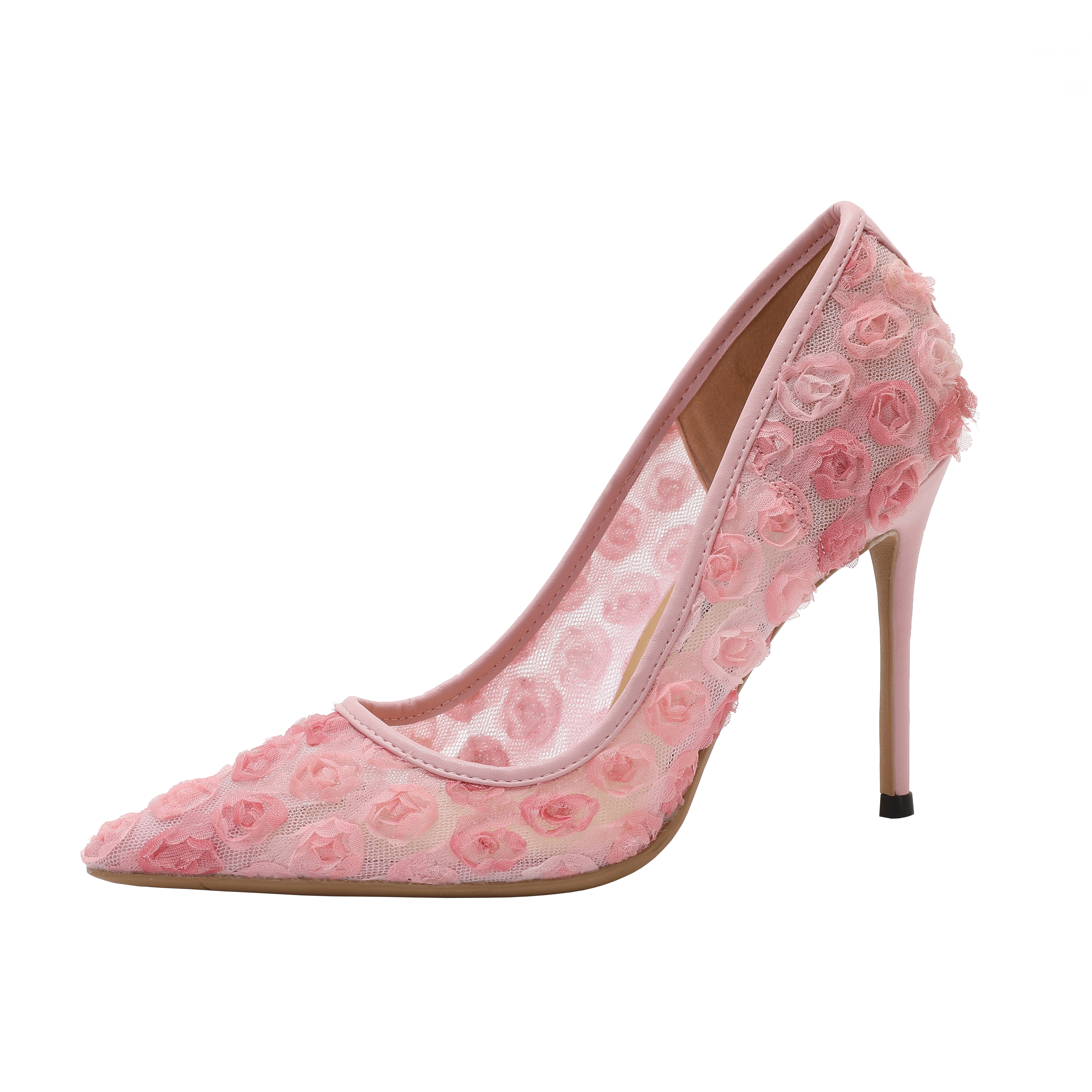 2025夏新款尖头浅口网纱透气细跟单鞋粉红色蕾丝性感高跟约会单鞋