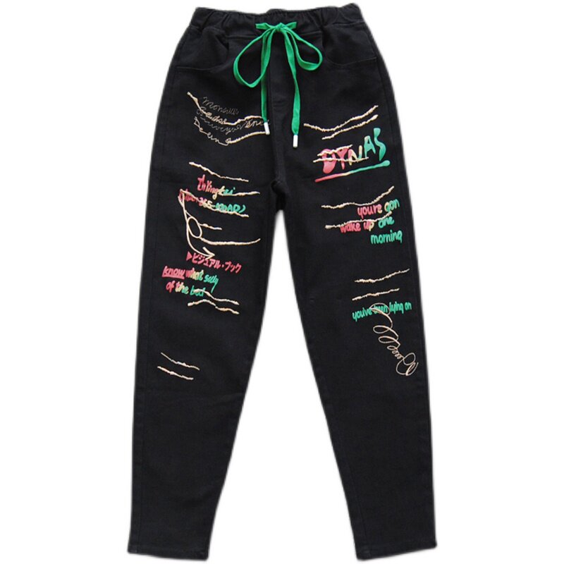 欧版春夏季松紧高腰胖MM显瘦印字母刺绣休闲长裤9分牛仔哈伦裤女