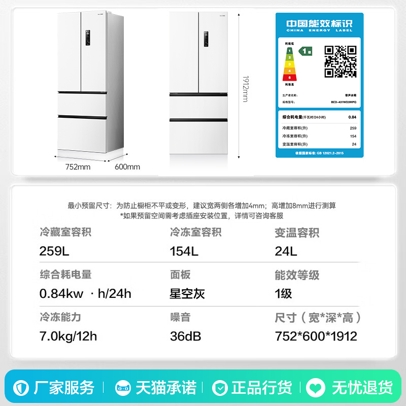 容声437L超薄零嵌入式冰箱白法式多门四门风冷无霜一级家