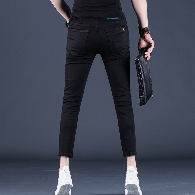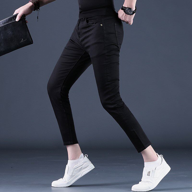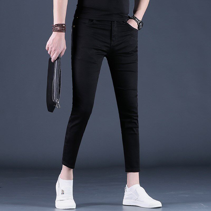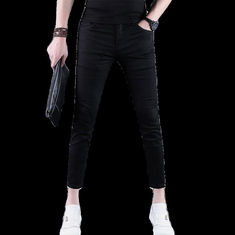 纯黑色裤子男九分裤男士牛仔裤潮流修身小脚夏季9分休闲裤新款薄
