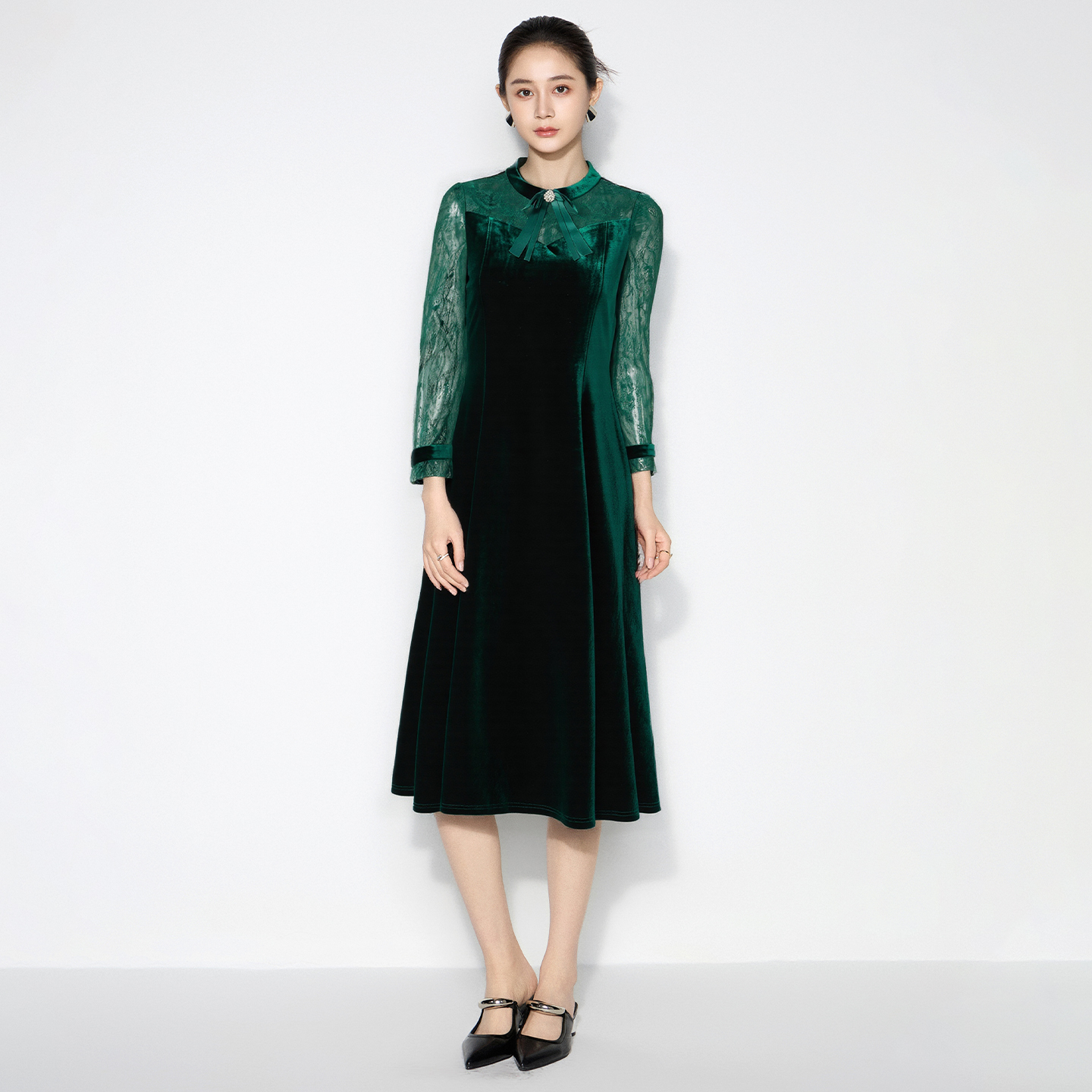 马天奴2025秋冬新款绿色丝绒拼接网纱连衣裙子法式收腰气质淑女风
