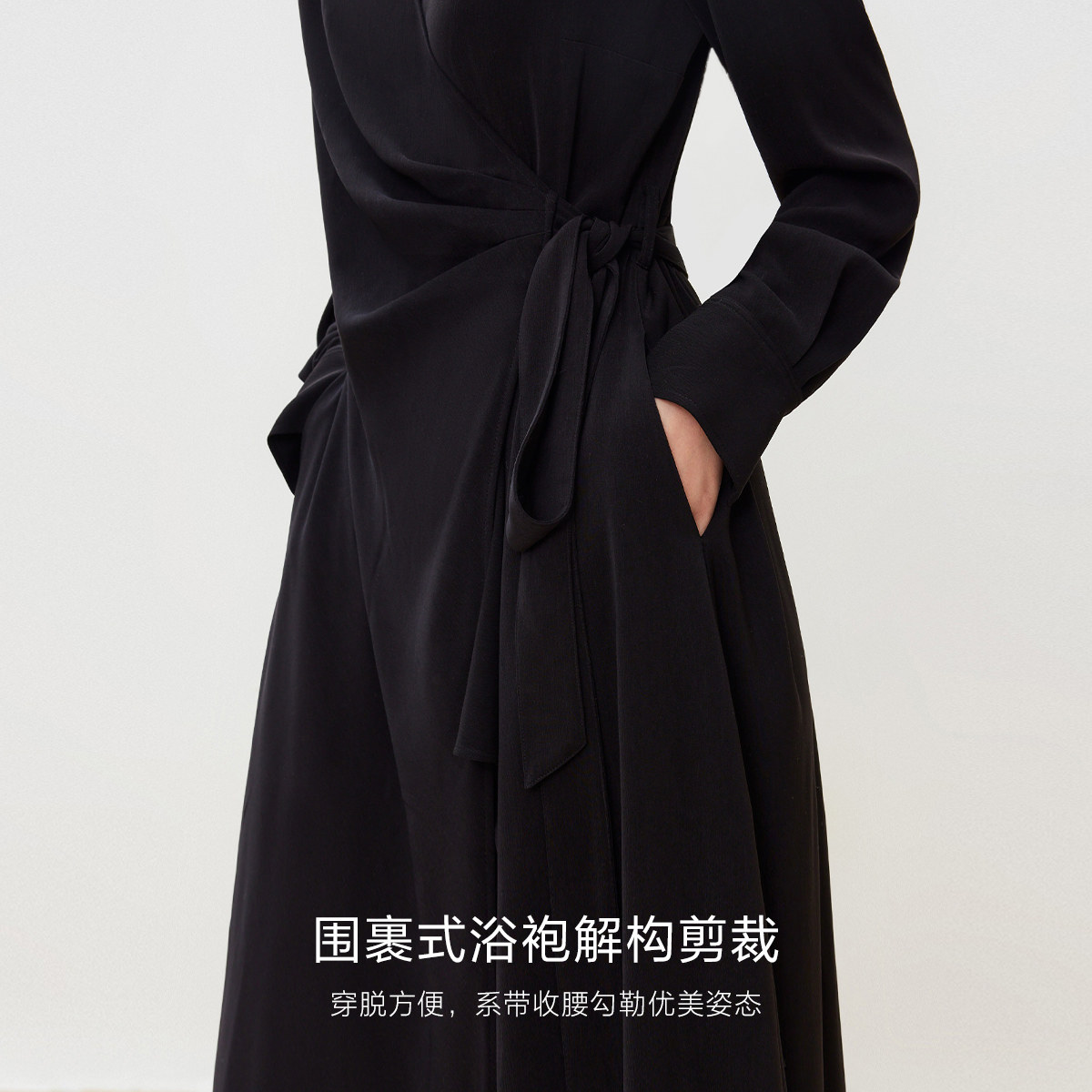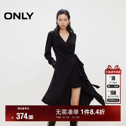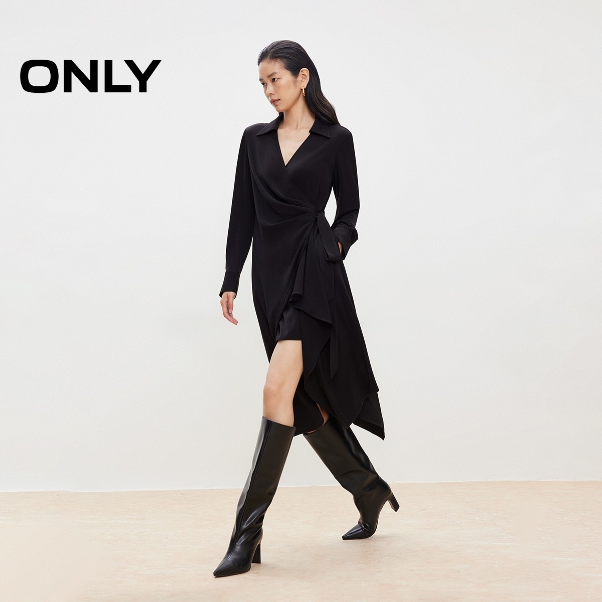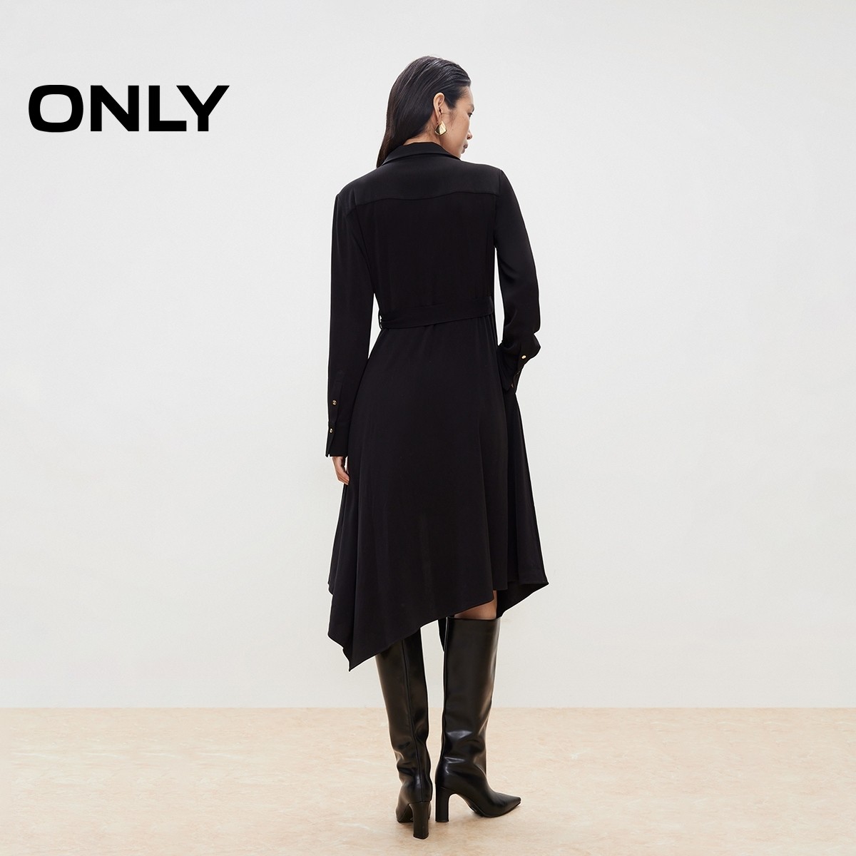ONLY2025秋季新款长袖V字翻领不规则下摆设计小黑裙中裙连衣裙女
