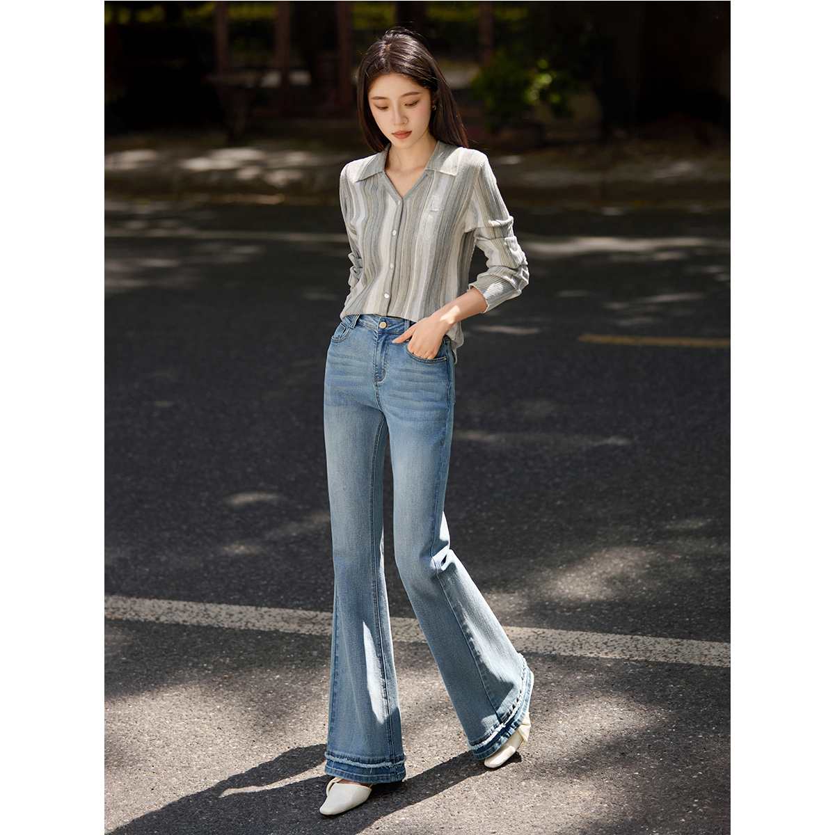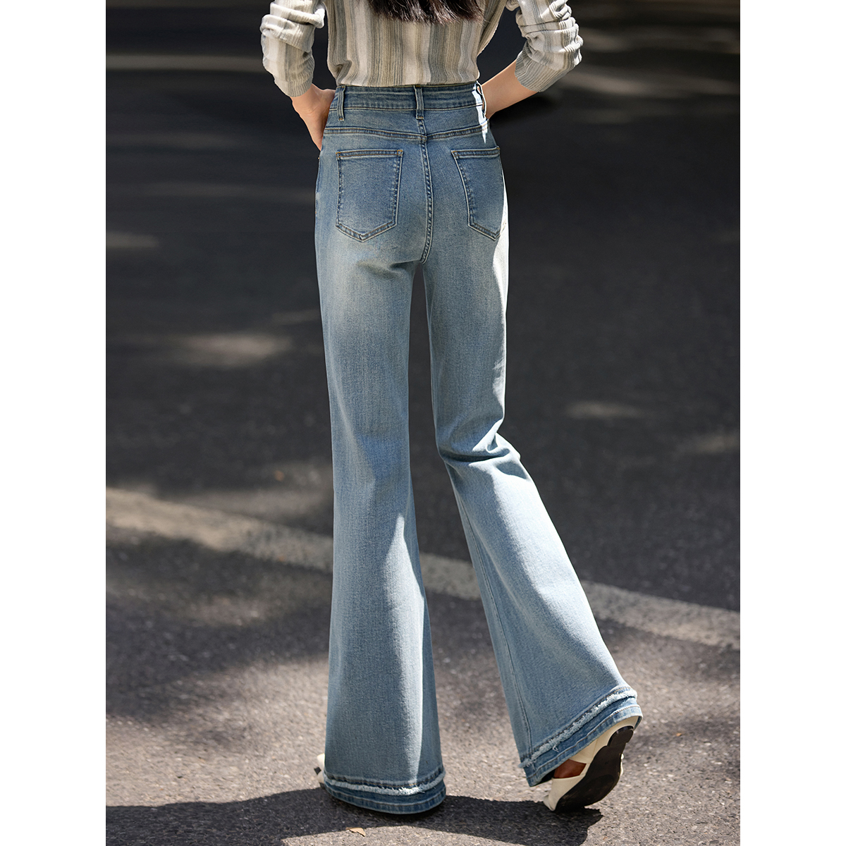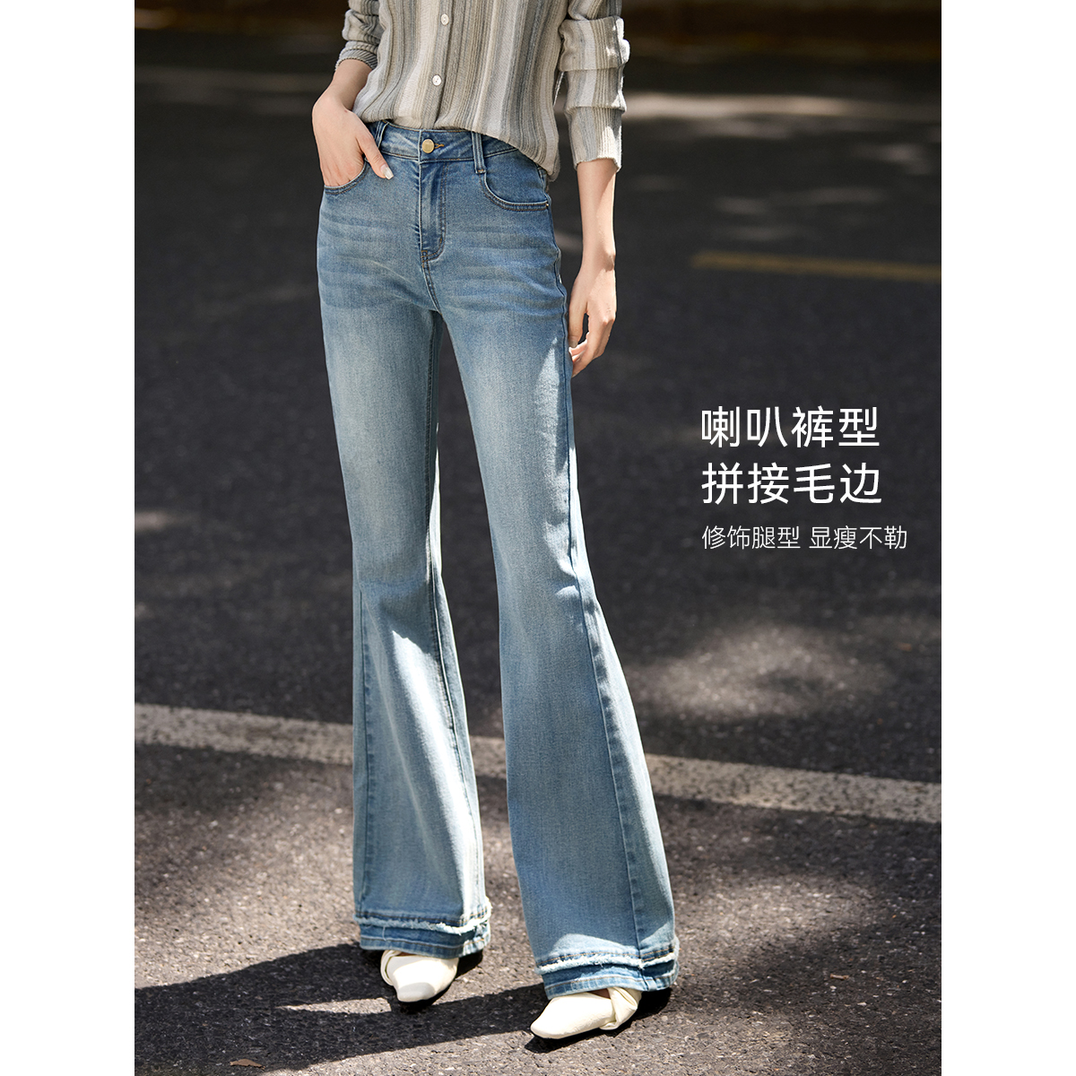 XWI欣未优雅通勤水洗棉弹力牛仔裤女秋季高腰显瘦拼接毛边微喇裤