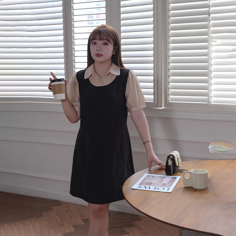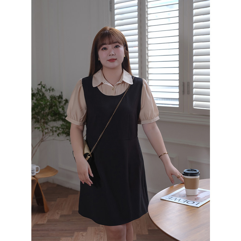 蓝若水大码女装衬衫领假两件连衣裙胖MM夏装新品通勤显瘦直筒中裙