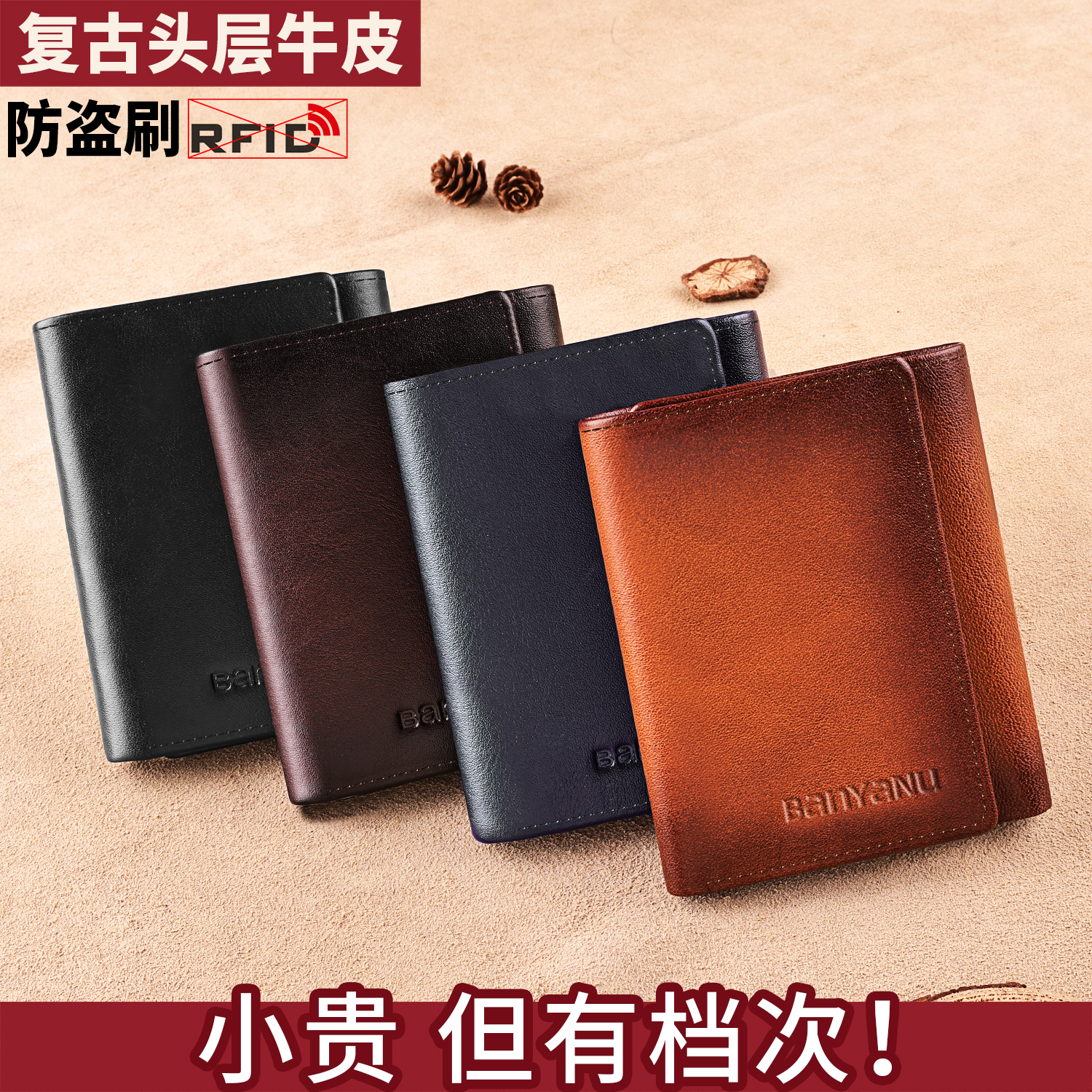 班亚奴2025新款头层牛皮钱包男真皮短款手工多卡位防盗刷卡包钱夹