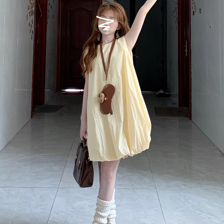 法式绝美黄色花苞蓬蓬连衣裙子女夏季2025新款小个子无袖背心短裙