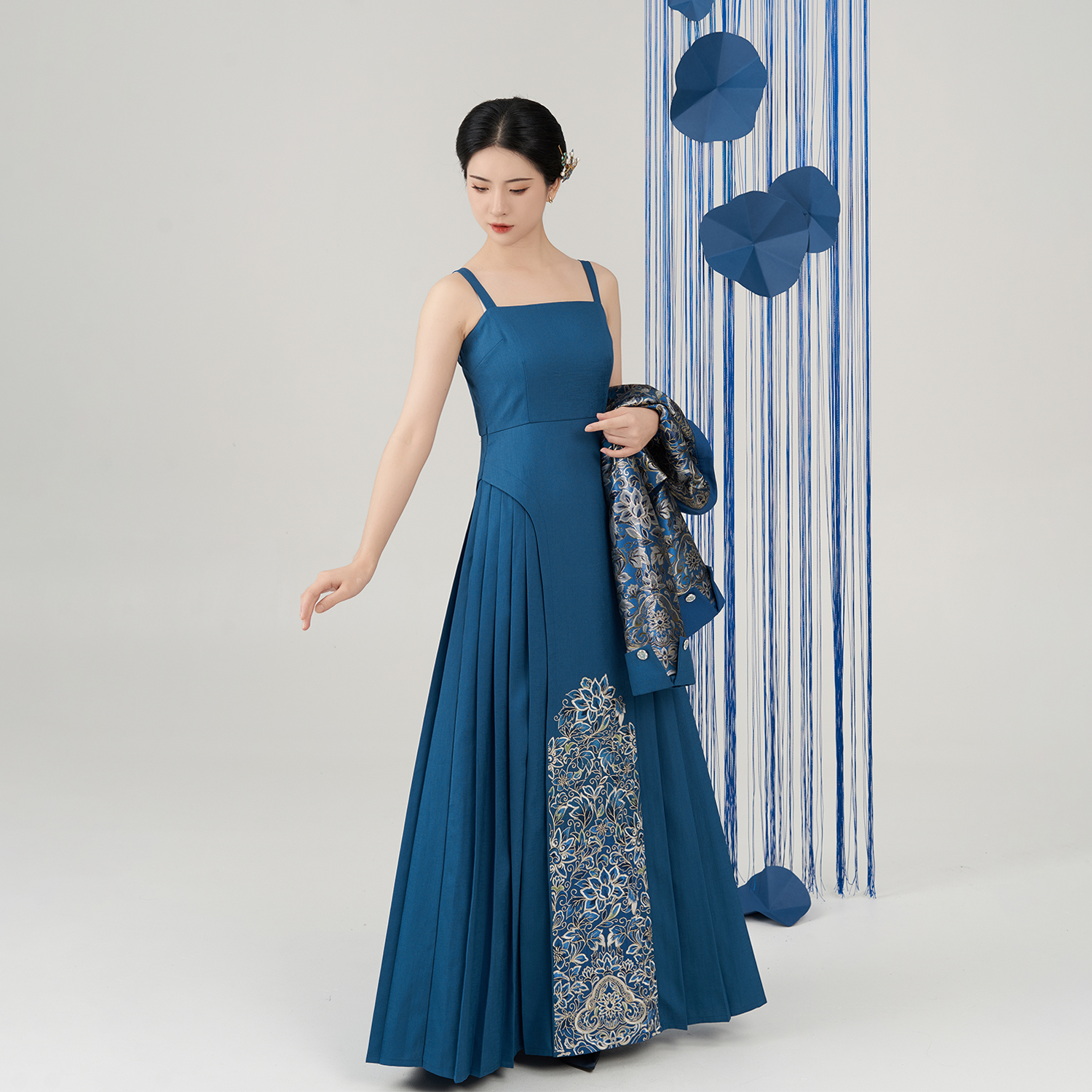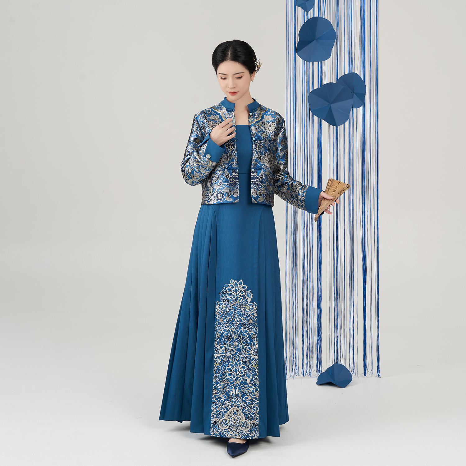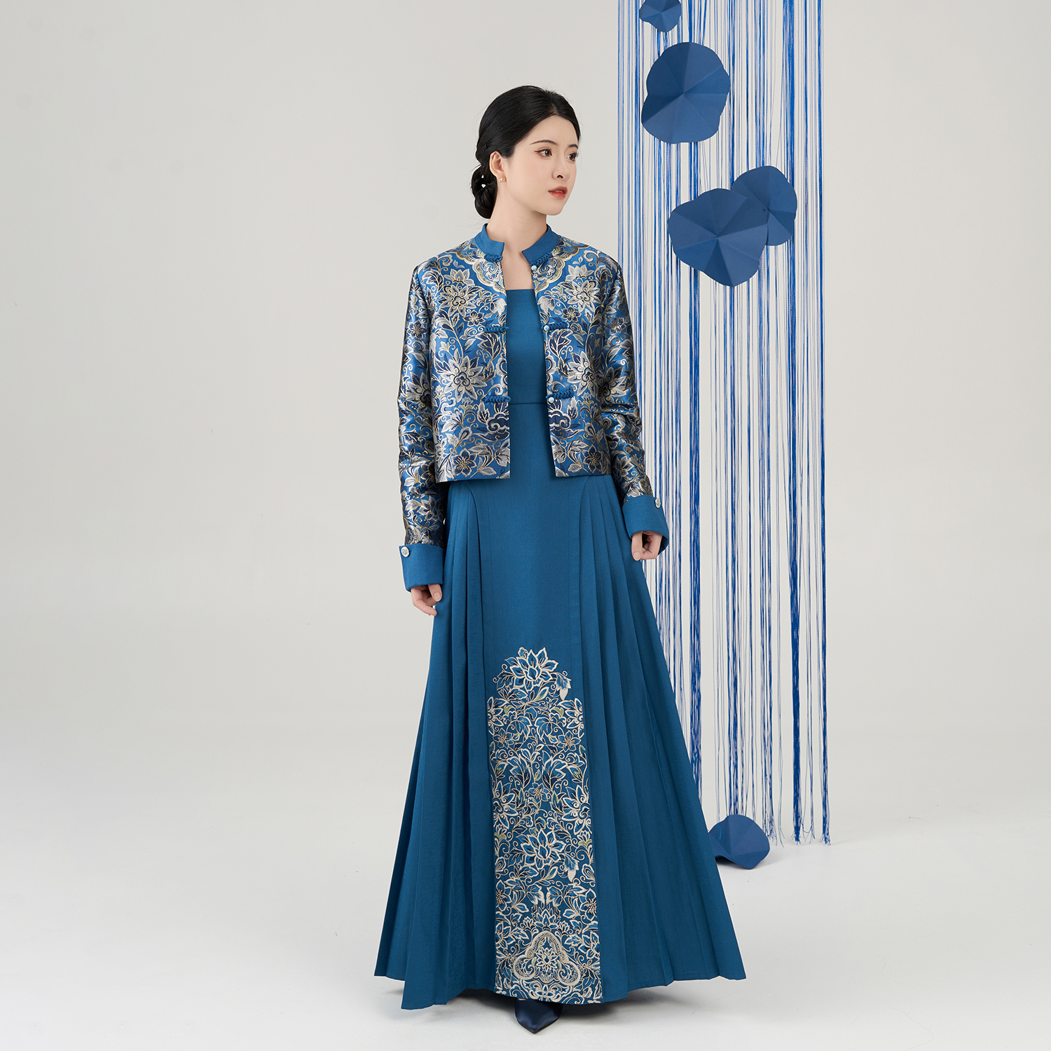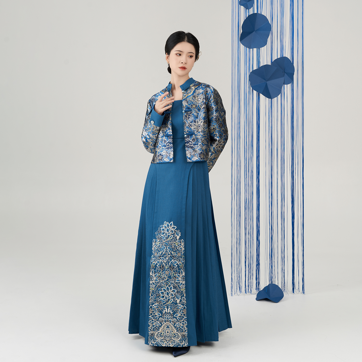 织造司[釉蓝枝]华彩东方秀款新中式国风妆花短外套吊带连衣裙套装