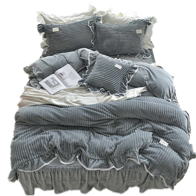韩国兔兔绒加厚保暖四件套纯色法莱绒蕾丝冬季公主风珊瑚绒4件套