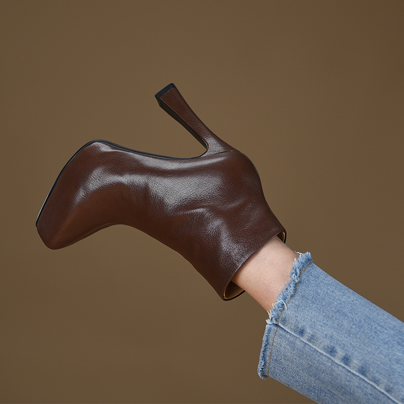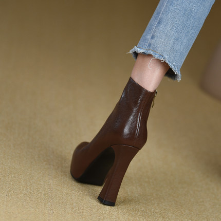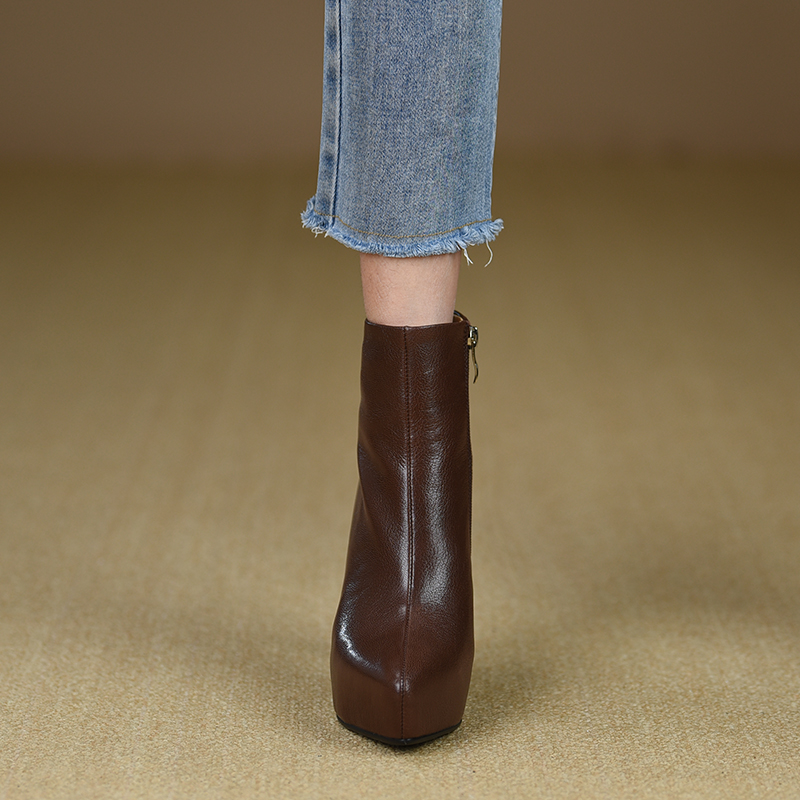 misili尖头粗跟短靴2024秋冬新款小个子高跟鞋内防水台厚底女靴子