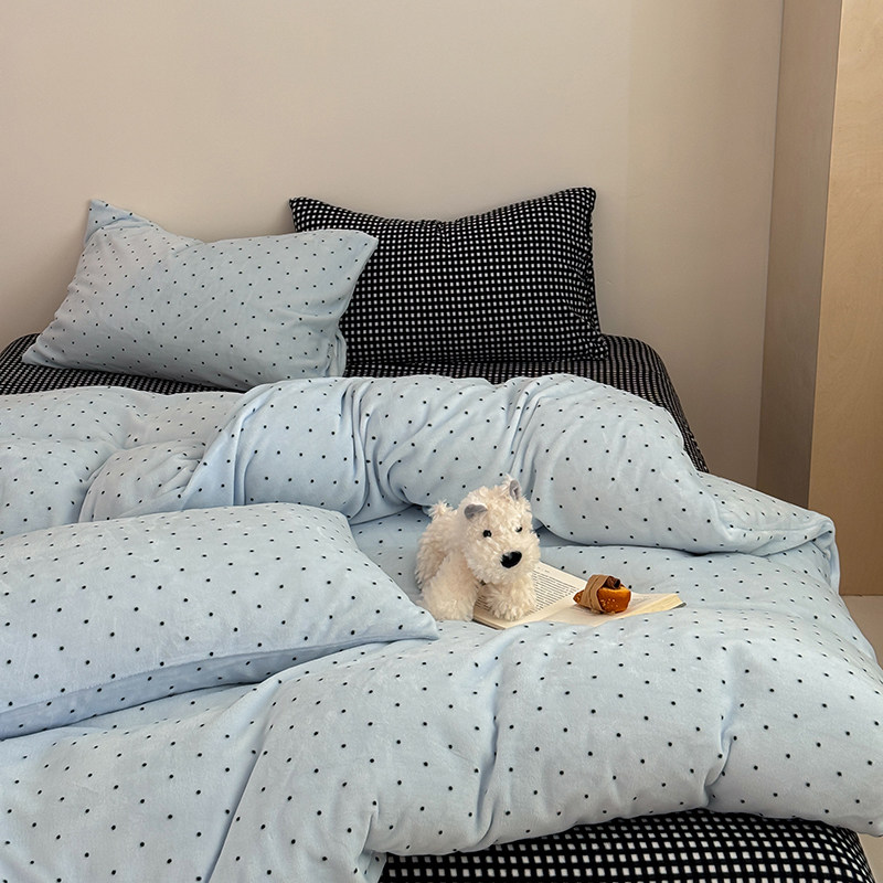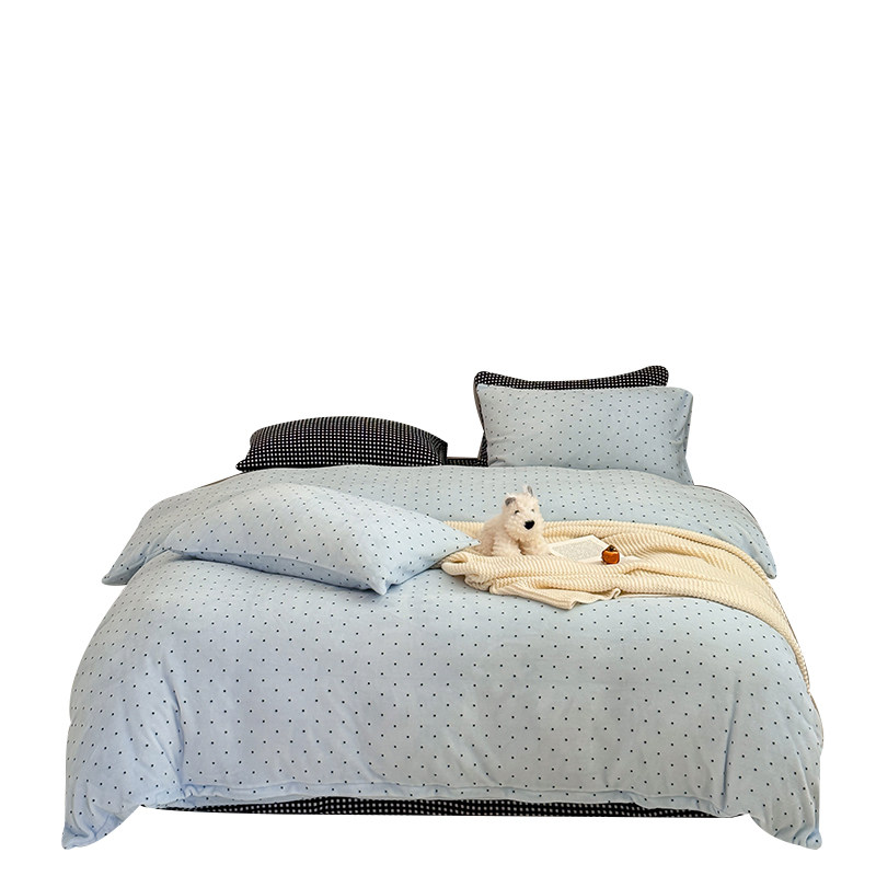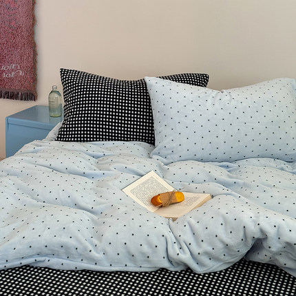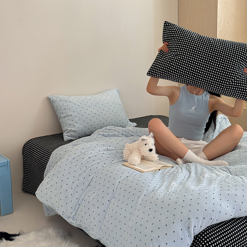 ins少女风撞色波点简约牛奶绒四件套秋冬保暖珊瑚绒被套床单床笠