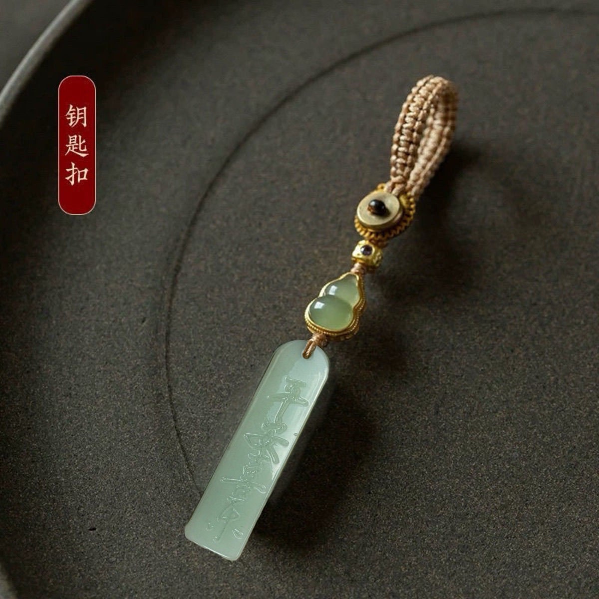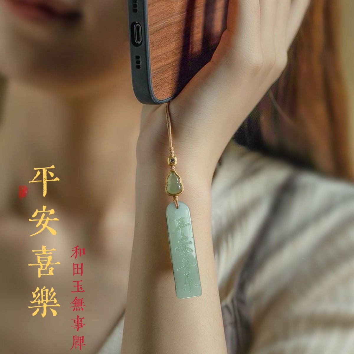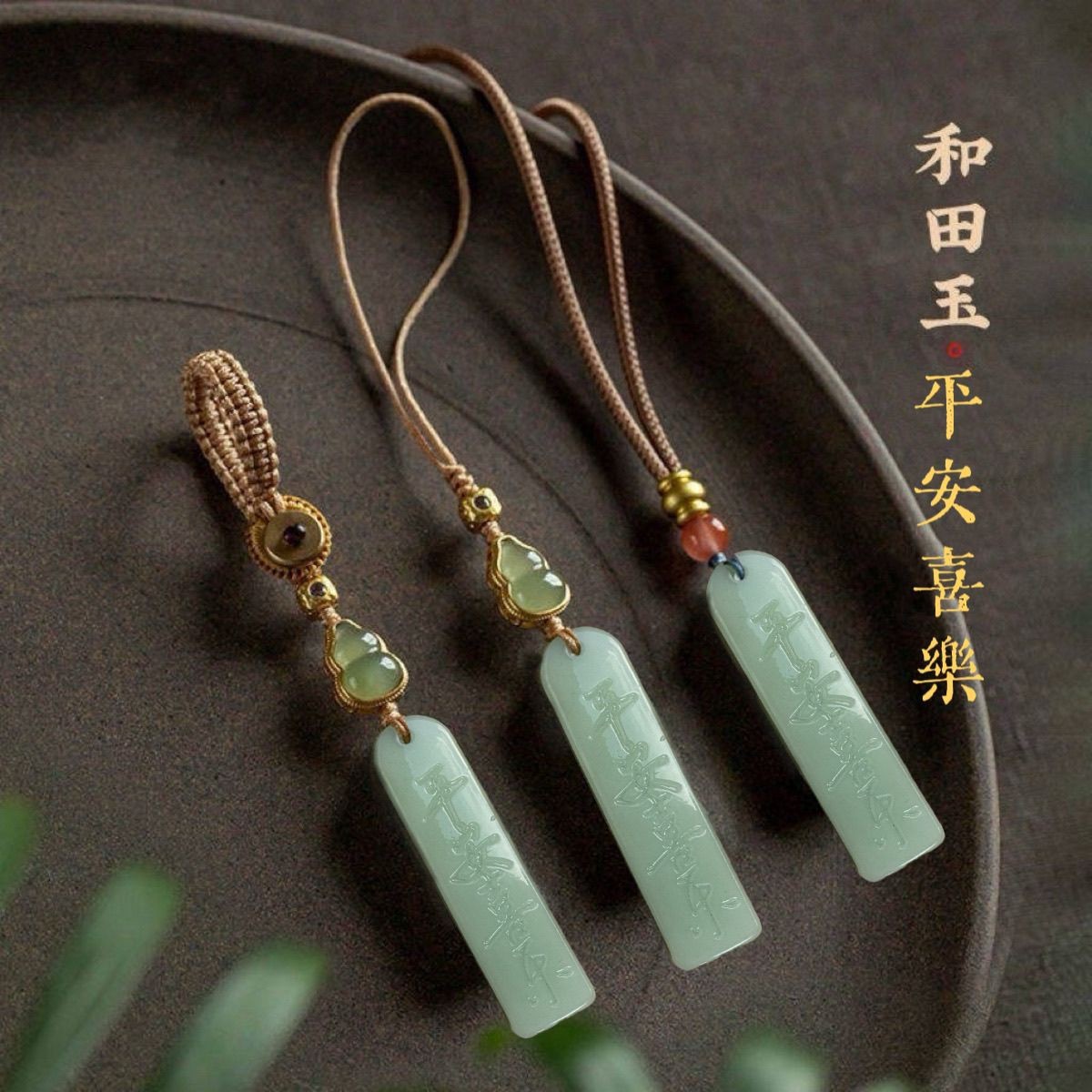天然和田玉平安无事喜乐汽车钥匙扣浅青简约吊坠高档男女款挂饰