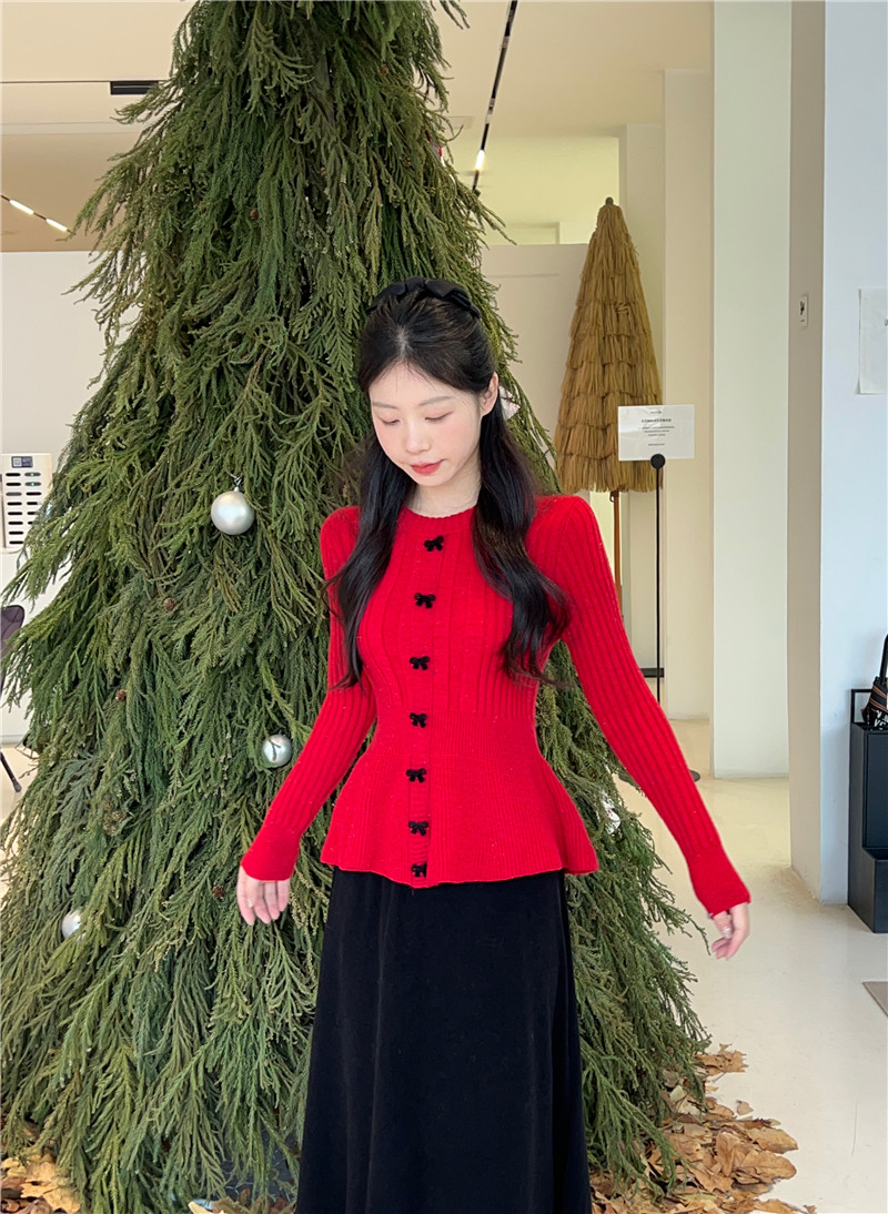 秋冬新款温柔风圣诞红色针织开衫修身内搭打底衫上衣毛衣女