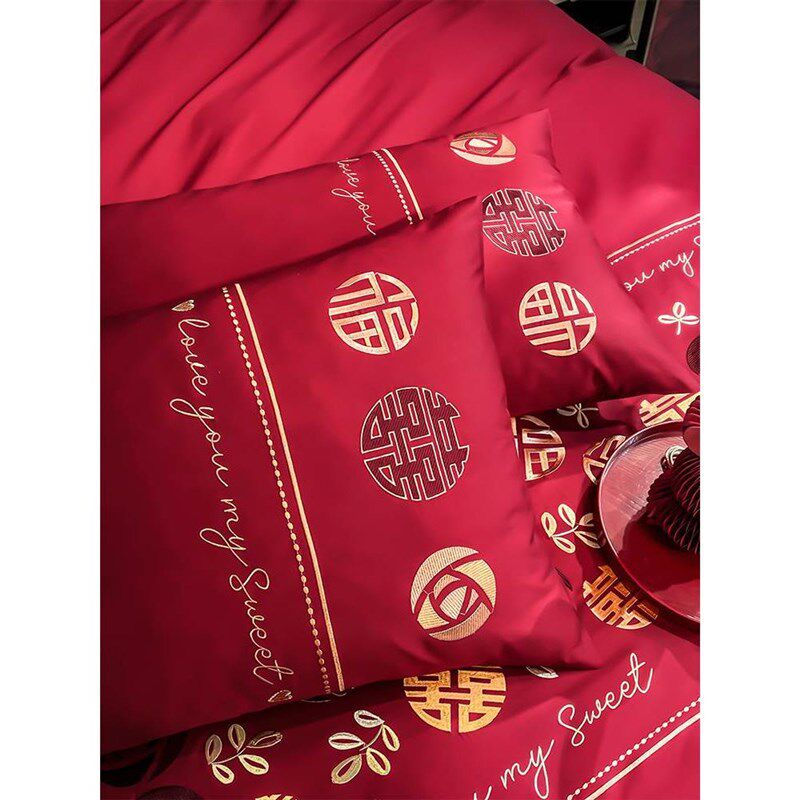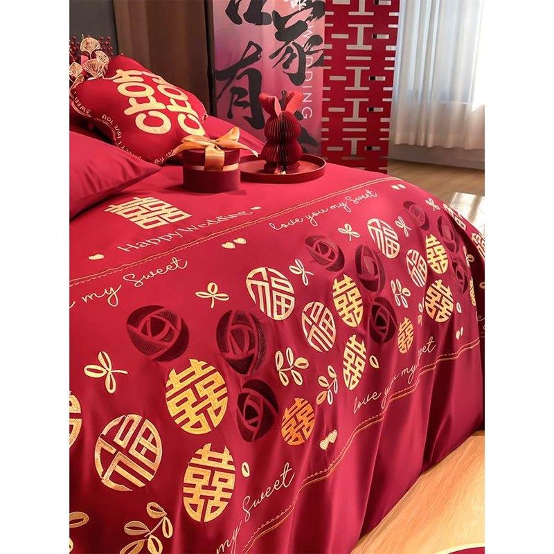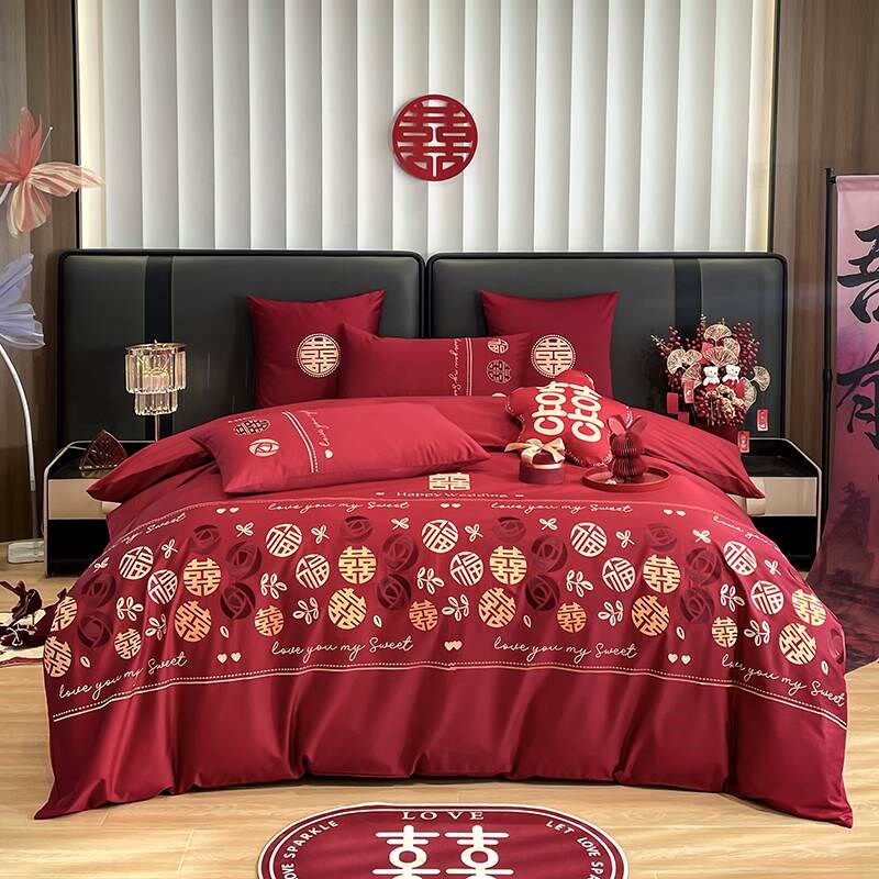 新婚高端结婚四件套100支全棉床上用品红色婚P庆喜被陪嫁床单被套