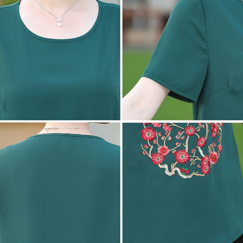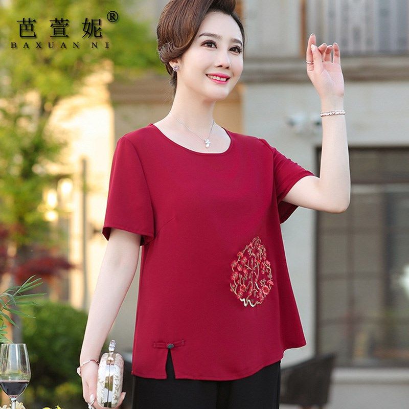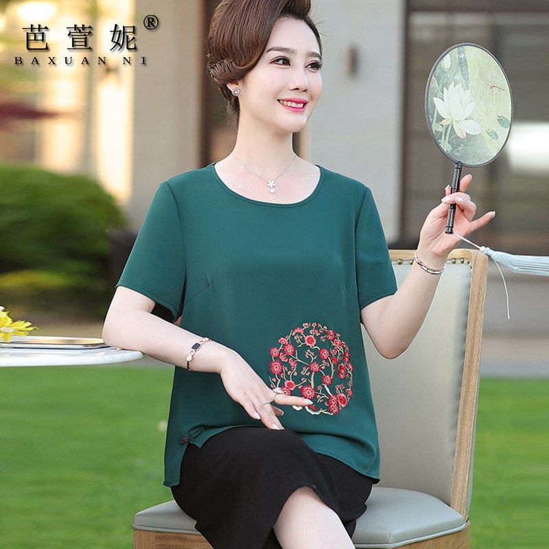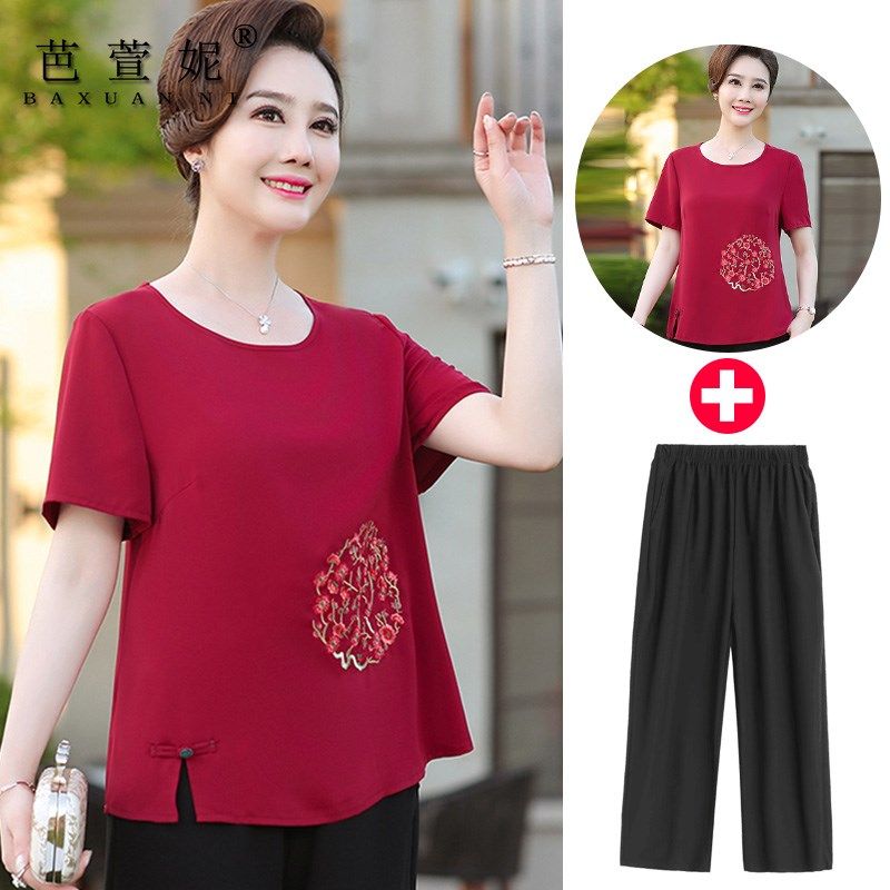 妈妈夏装套装新款加肥加大码雪纺衫短袖t恤上衣中老年女装两件套