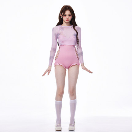 假面猫 纯欲风扎染连体泳衣女性感小胸聚拢长袖网纱网红温泉度假