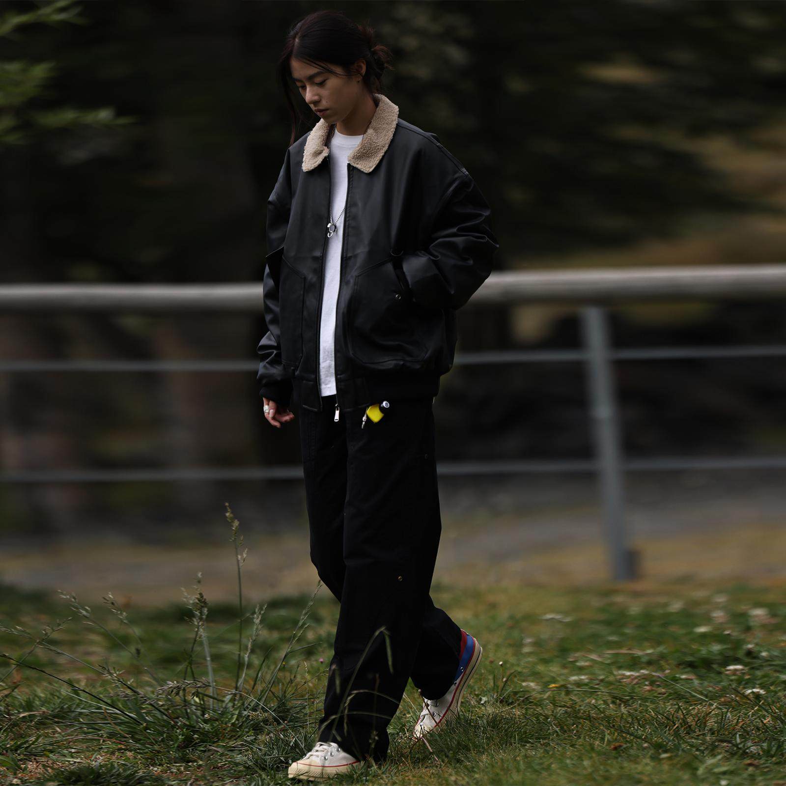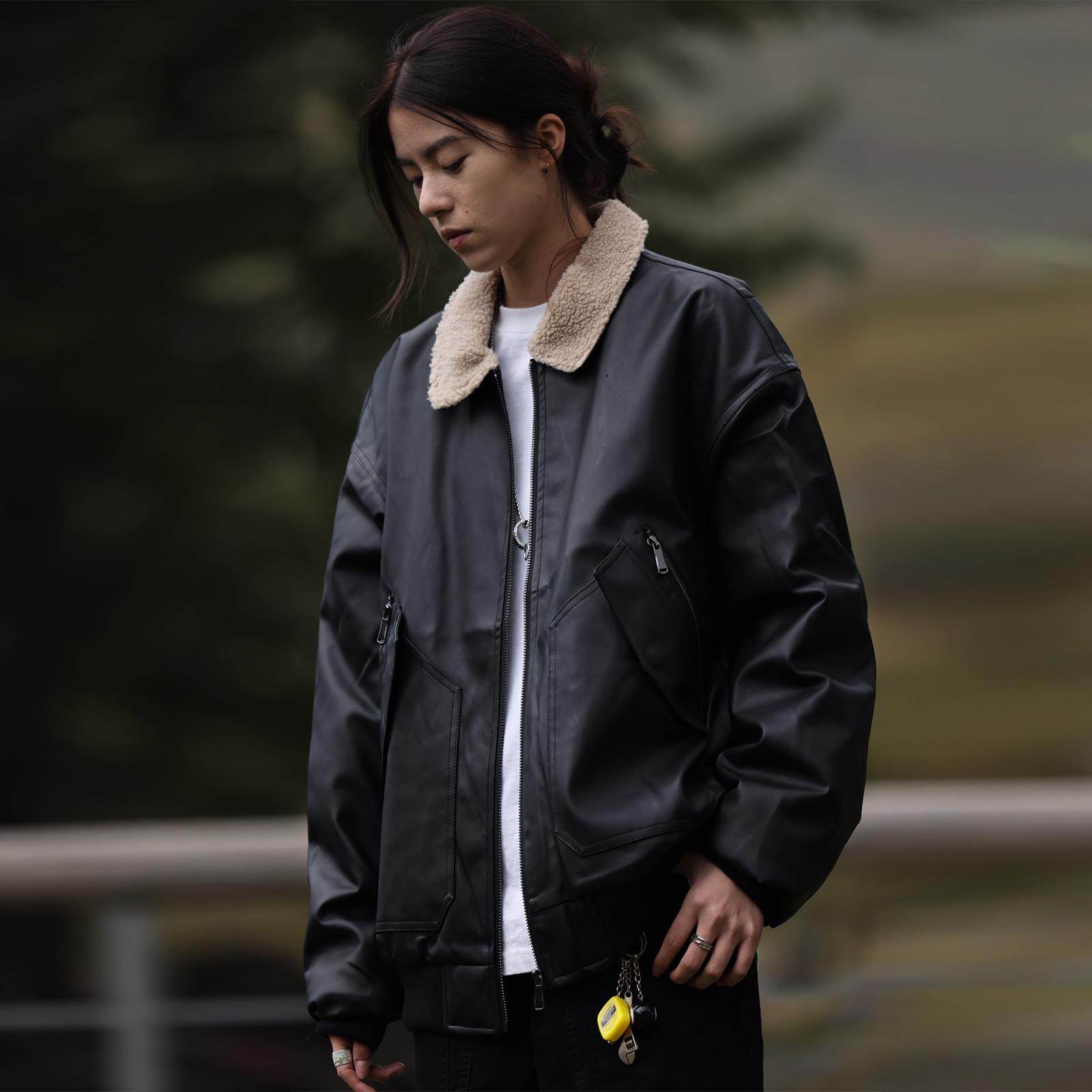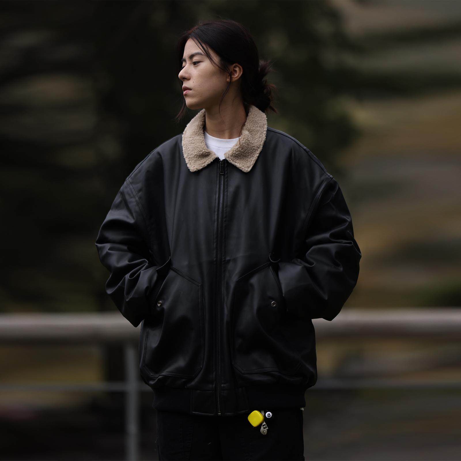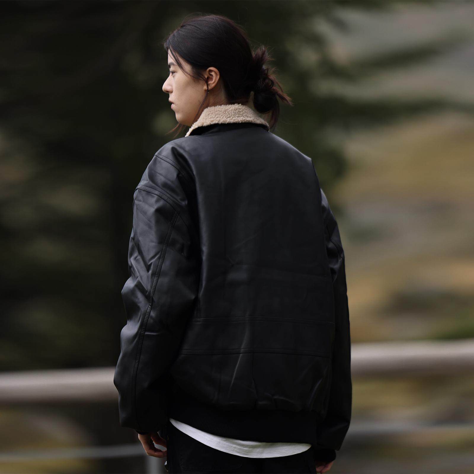 Nobodyknows美式复古廓形羊羔毛拼接PU皮衣夹克棉衣男女机车外套
