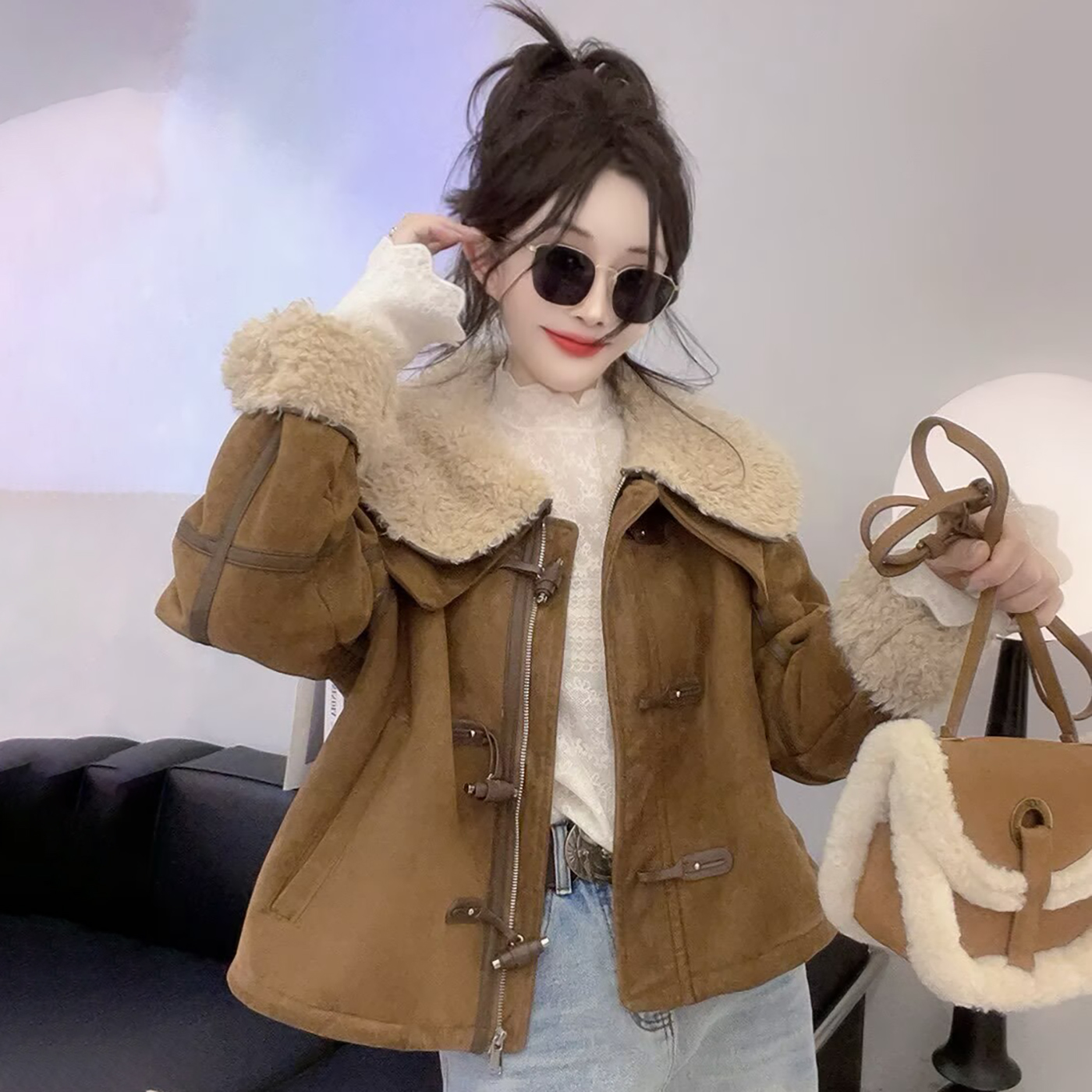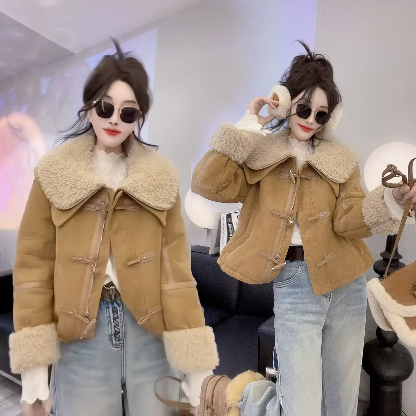 2025冬季爆款加绒加厚仿鹿皮绒短款外套女高级感皮毛一体上衣棉袄