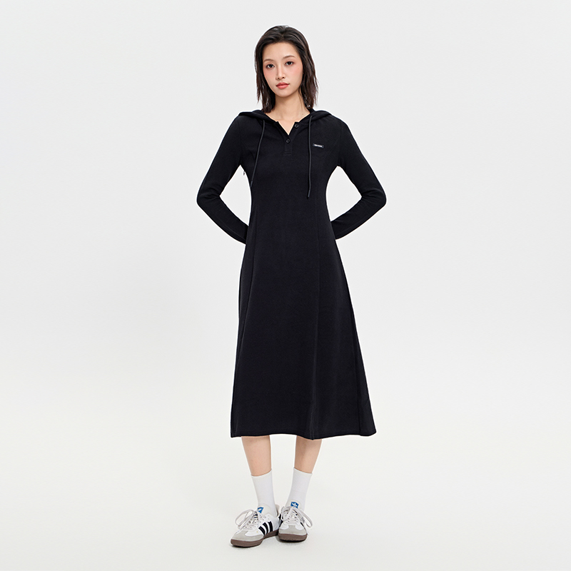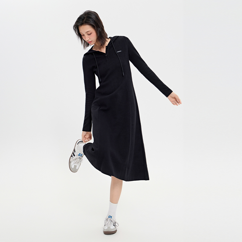 商场同款]北欧时刻黑色连帽卫衣连衣裙女2025年秋冬新款A字长裙子