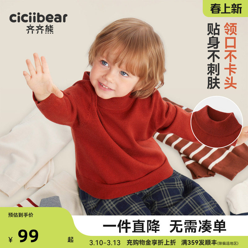 齐齐熊男童红色毛衣冬儿童半高领宝宝条纹打底衫针织新年毛线上衣