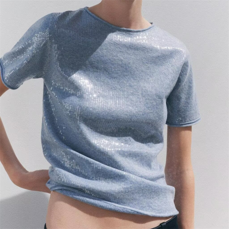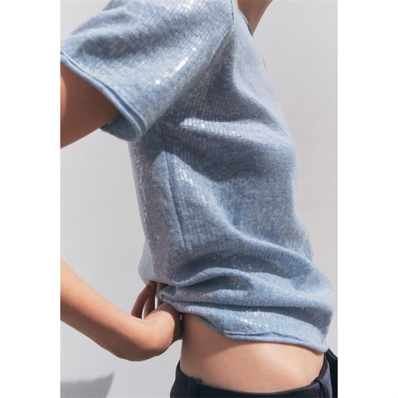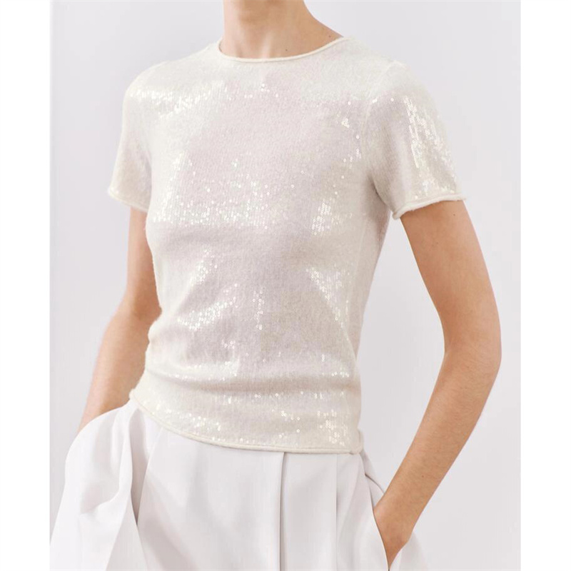 BANA西班牙外贸出口亮片闪闪圆领卷边正肩短袖T恤女夏季短款上衣
